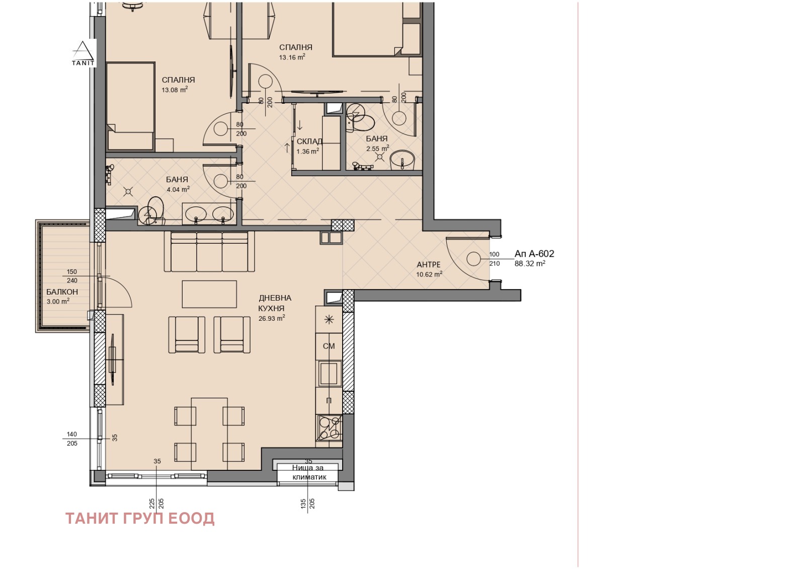 Предлагаме за продажба ап. А6 02, тристаен, на шести жилищен етаж (кота +15,00м.) с РЗП 88 кв.м. (108кв.м. с вкл. общи части и 2кв.м. склад) в новата ни сграда Lion Hill етап 1. Цената на апартамента е 228 000 евро с вкл. ДДС. В етап 1 и етап 2 все още има избор на едностайни, двустайни, тристайни, четиристайни апартаменти с различни големини и изложения, на различни етажи, както и паркоместа - разгледайте всички свободни обекти на уебсайта ни tanit.bg.