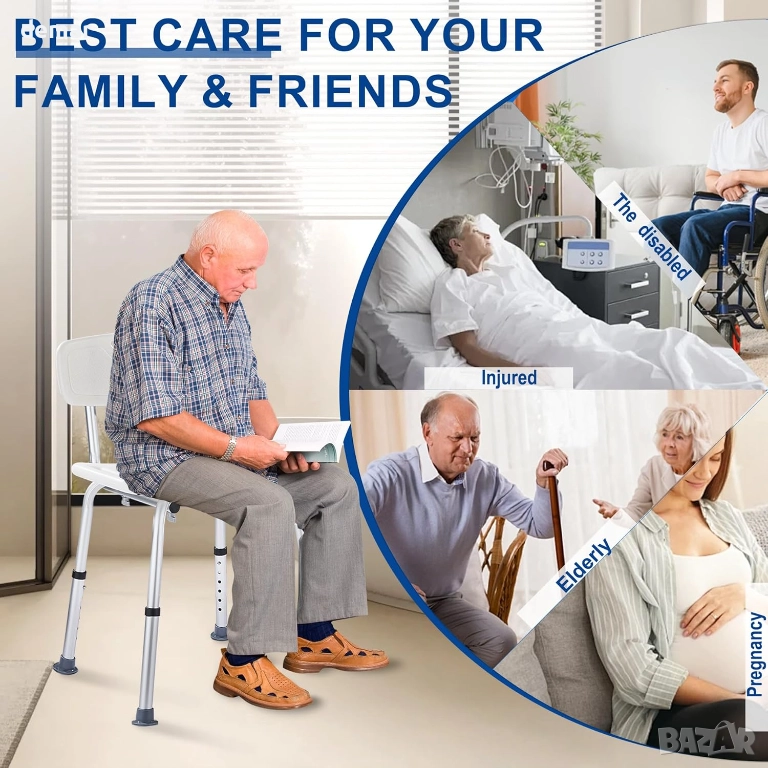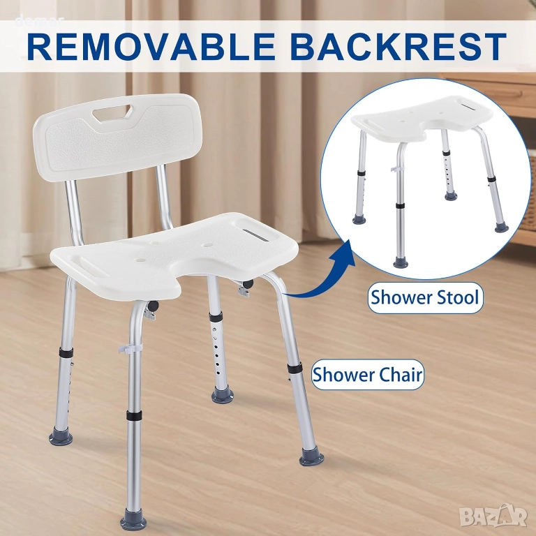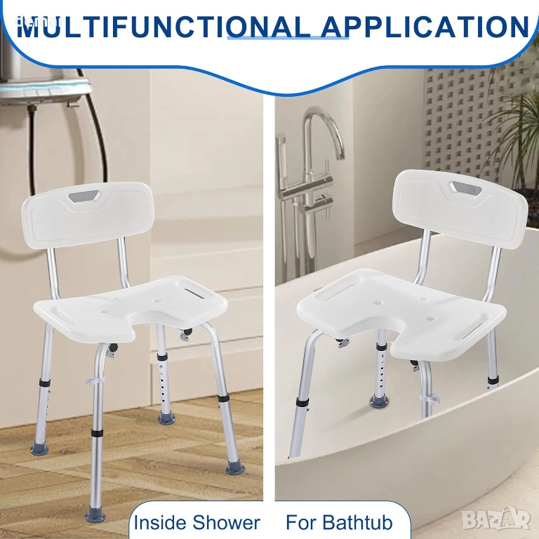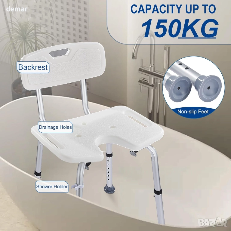 Този душ стол е със стабилна, лека алуминиева рамка с товароносимост 150 кг, U-образна седалка за по-лесна хигиена и подвижна облегалка, която му позволява да функционира като стол или табуретка. Включва държач за душ, дренажни отвори за удобство на седалката и неплъзгащи се гумени крачета за безопасна употреба във влажни помещения. Височината се регулира на шест нива, за да отговаря на различните потребители, и се сглобява бързо без инструменти, което го прави подходящ за компактни бани и вани.