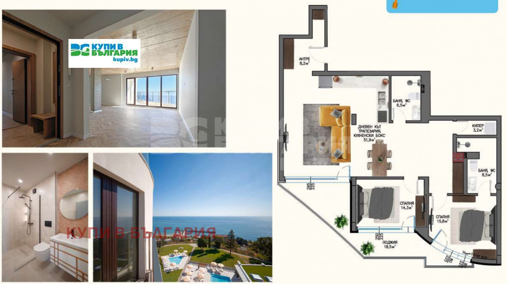 'Купи в България' има удоволствието да ви представи прекрасен просторен тристаен апартамент за продажба завършен до ключ в премиум жилищен комплекс с АКТ 16 от затворен тип на метри от морето.