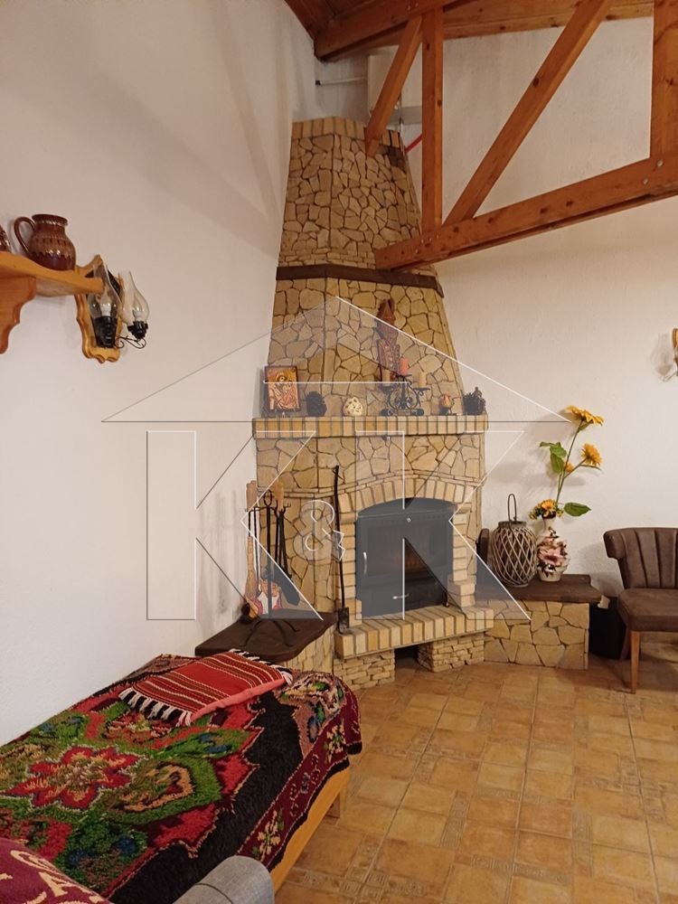 Нова къща с площ от 181 кв.м. на партерно ниво и подпокривно пространство, напълно обзаведена и оборудвана, с голям 200 л. бойлер и климатично отопление. Партерното ниво представлява един голям хол с камина, барплот, маси и столове, кътове за отдих и кухня с професионални уреди за готвене. Има възможност за преустройство на хола като три спални и хол. В двата края на подпокривното пространство са устроени две спални.