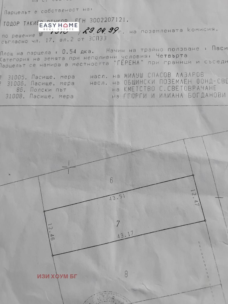 Предлагам парцел 0.540 кв м в село Световрачане , м. ' ГЕРЕНА'. До регулация. До ток и вода, равен.