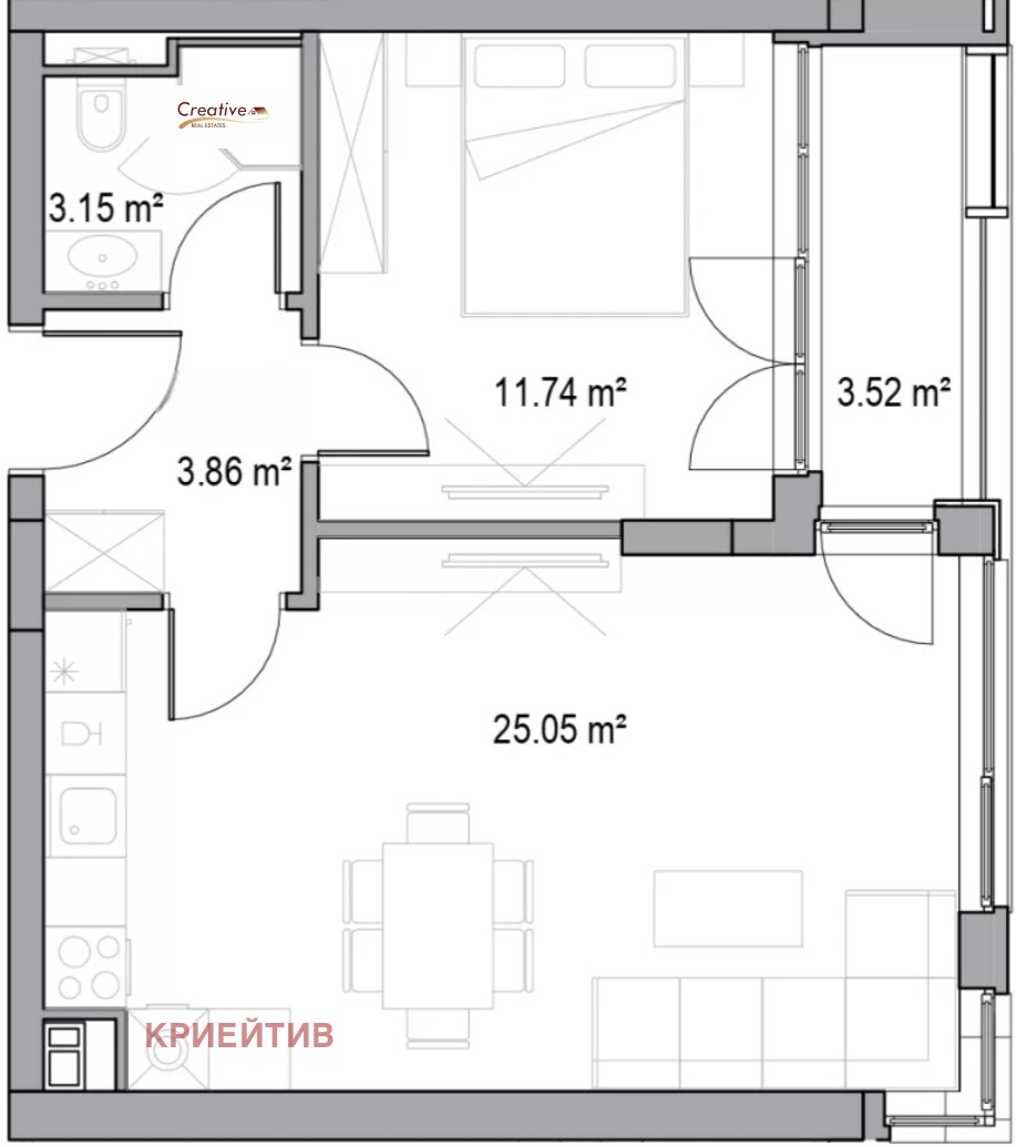 Разпределение на жилището: всекидневна с кухненски бокс, спалня, баня с тоалетна, входно антре, и тераса (лоджия).