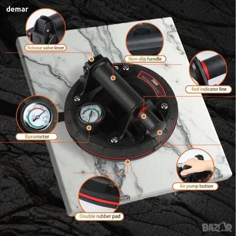 манометър осигурява ясно наблюдение на засмукването в реално време, което позволява бързо повторно напомпване без отстраняване. Работата е лесна с лесен триетапен процес и механизъм за бързо освобождаване. Комплектът включва здрав, удароустойчив калъф за съхранение, който държи двата модула сигурни и преносими. Подходяща за гладки, непорести повърхности, тя борави с материали като стъкло, камък, дърво и метал, което я прави практична за повдигане на тежки панели, преместване на уреди или монтаж на големи тела.