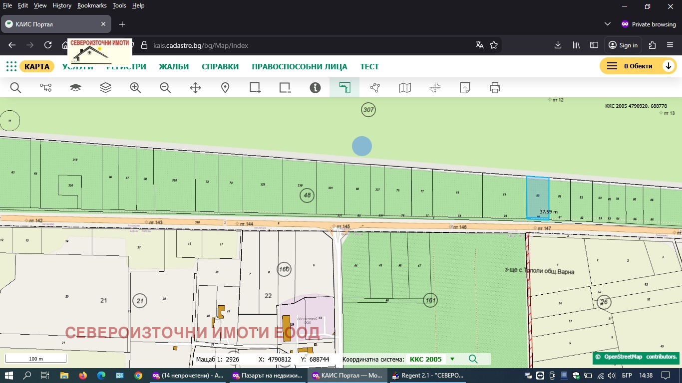 ID. 4466 Североизточни имоти предлага за продажба промишлен парцел с 38м на старият път за гр. София /ГП-4/ преди отбивката за с. Тополи в дясно в м-ст Чанлъка или Черешоваата градина. По новоприетият план на гр. Аксаково е отреден за Обществено обслужващи дейности, складове , магазини,шоурум и др.