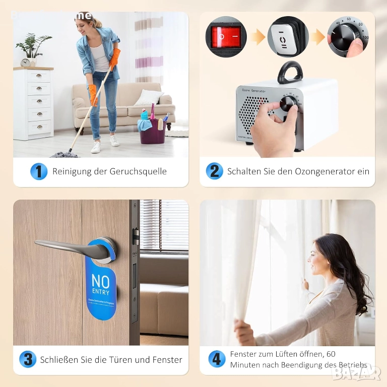 Почистете зоната, която ще се обеззаразява, преди употреба. Генераторите на озон не могат автоматично да премахнат източника на миризма; ако източникът на миризма не бъде отстранен, генераторът на озон няма да помогне!