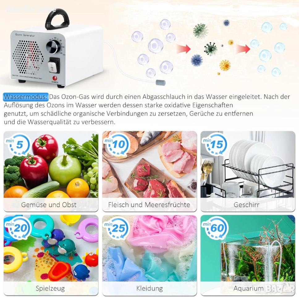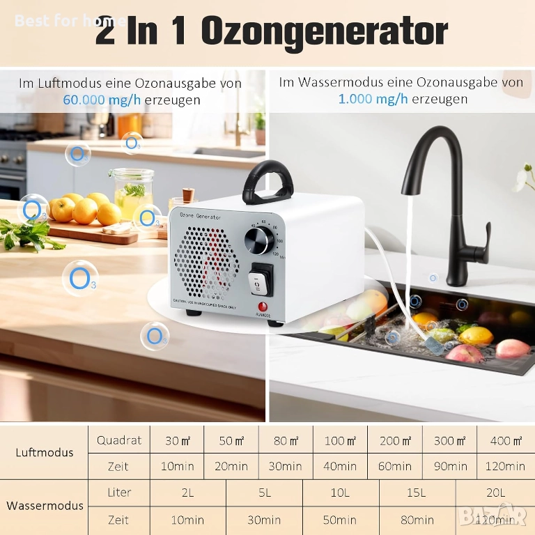 Два режима на почистване: озоновият генератор 2 в 1 е оборудван с режим „въздух“ и режим „вода“. Режимът „въздух“ се използва за почистване на относително големи площи, като например дневни, кухни, мазета, автомобили и други интериорни помещения. В режим „вода“ се използва въздушен маркуч за въвеждане на озон в определени течности или малки площи за почистване. Така например, озонирана вода се използва например за почистване на плодове и зеленчуци, а озонът се използва за почистване на шкафове, килери, легла за домашни любимци и други малки затворени пространства.