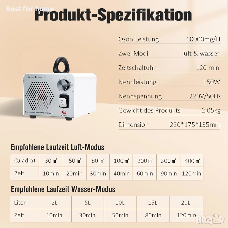 Времето, необходимо на озона за пречистване на въздуха, зависи и от концентрацията на миризмите и условията на околната среда. Ако ефектът на пречистване не е очакваният, удължете зададеното време, докато миризмата изчезне.