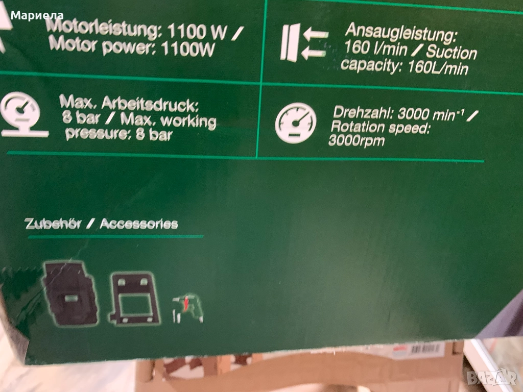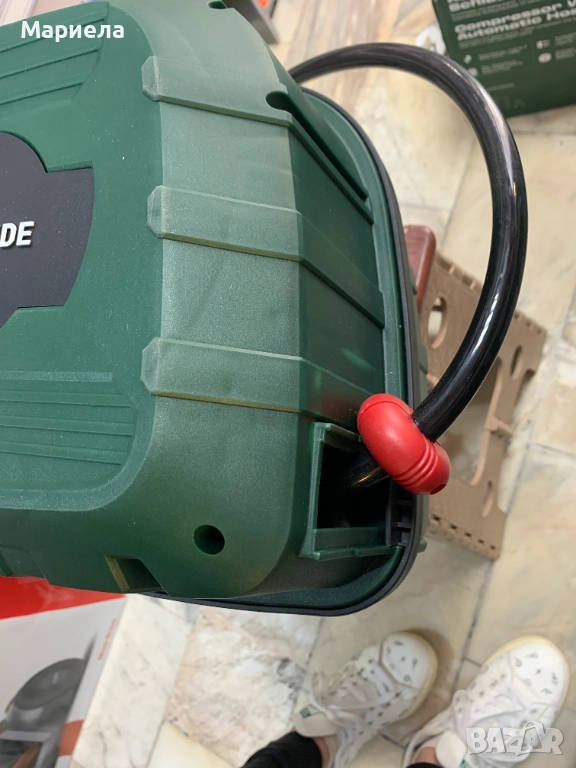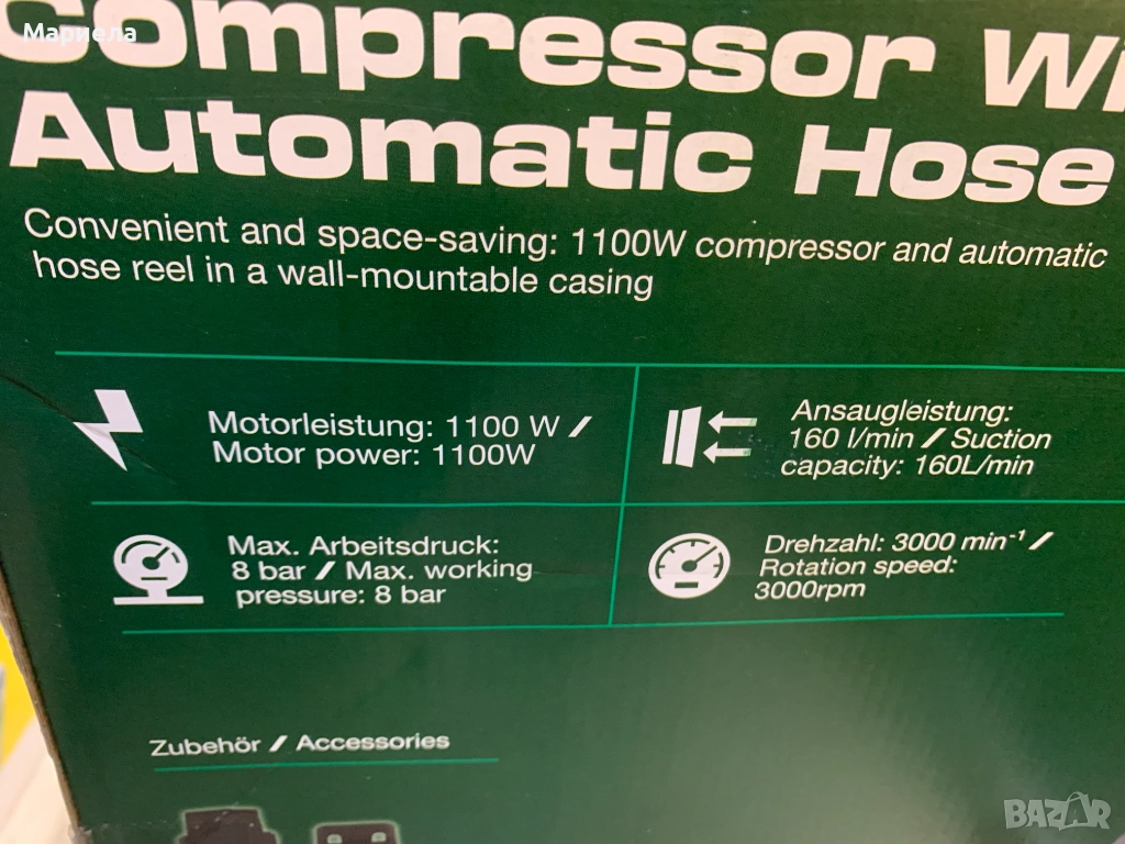 Компресора е с мощност 1100 W и автоматична макара за маркуч в корпуса с опция за стенен монтаж .