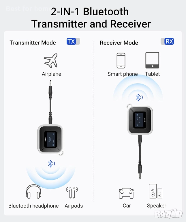 2 в 1 Bluetooth предавател-приемник: Подобрете аудио изживяването си с нашия универсален AUX Bluetooth адаптер! В режим на предавател се наслаждавайте на безжична свързаност със системи за забавление по време на полет, фитнес оборудване и телевизори. Освен това, за безпроблемна интеграция с различни аудио интерфейси на самолети, сме включили двоен 3,5 мм AUX адаптер за ваше удобство. Превключете без усилие в режим на приемник, за да предавате поточно аудио от телефона или таблета си към кабелните високоговорители или стерео системата на колата.