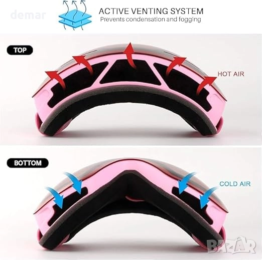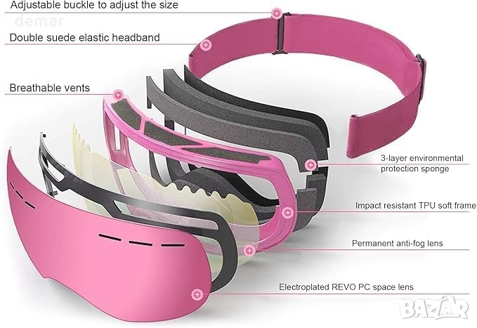 очила са с двуслойна система от лещи с покритие против замъгляване и силна дишаемост, за да се поддържа ясно зрение, докато външната леща с REVO покритие блокира вредните UV лъчи и намалява отблясъците. Удароустойчивите PC лещи и гъвкавата TPU рамка предлагат подобрена защита на очите, подкрепени от дебела омекотяваща пяна за комфорт. OTG дизайнът им е подходящ за диоптрични очила, а тройнослойната пяна осигурява топлина и сигурно уплътнение. Регулируема, гъвкава лента за глава осигурява стабилно прилягане и работи безпроблемно с повечето ски каски както за възрастни, така и за юноши.