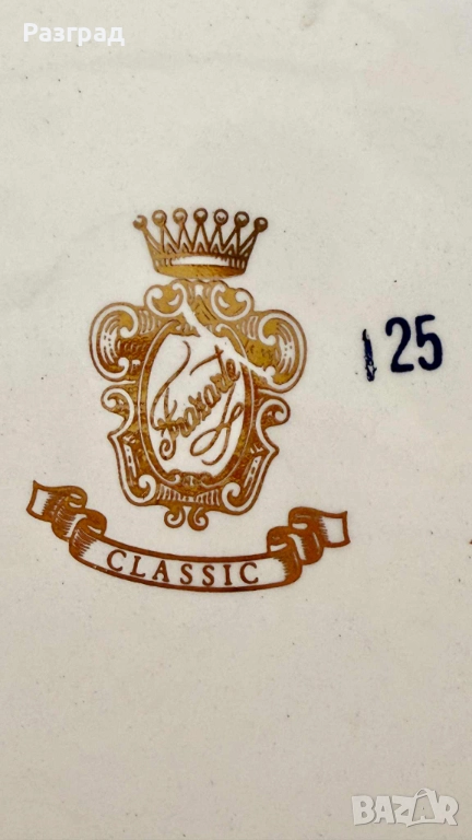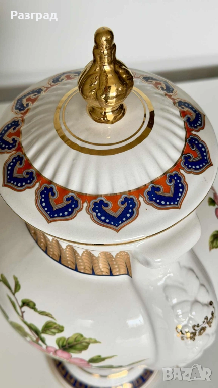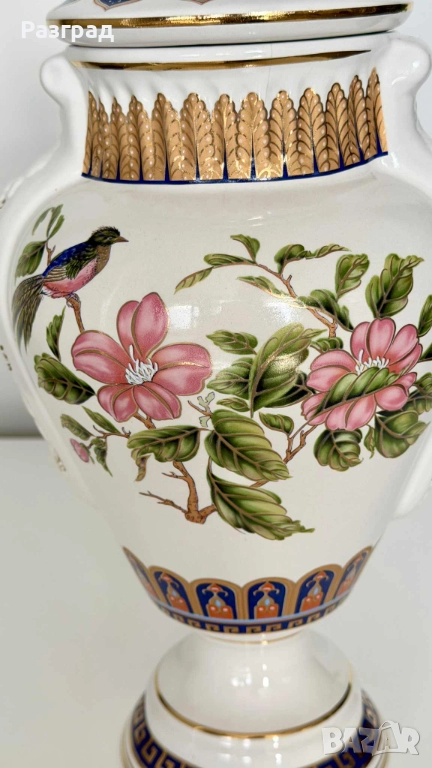 Винтидж порцеланова ваза с капак- голяма, обемна и с внушително присъствие. Форма на амфора. Пищна полихромна декорация с изображения на ябълкови цветове и райски птици. Произведена в Португалия от Frazarte , от серията им classic (1816-1826г.). Маркирана със златен печат. В чудесно винтидж състояние.