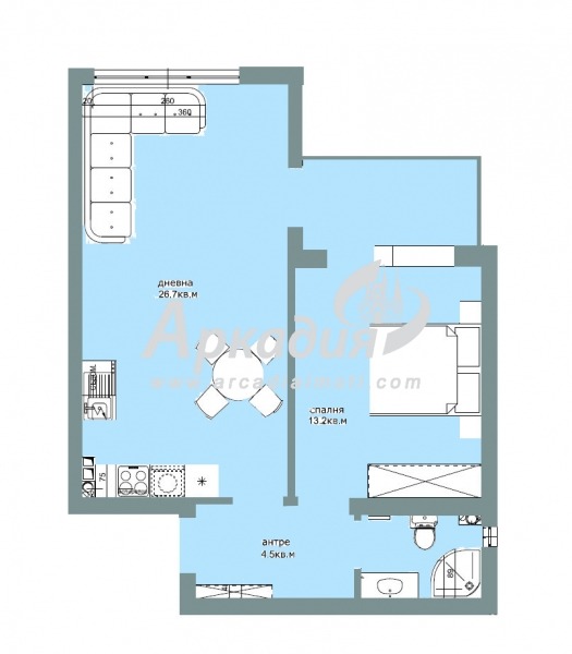 Жилището, което Ви предлагаме се състои от дневна с кухненски бокс, спалня, баня с тоалетна, входно антре и тераса. Предлага се завършено на шпакловка, замазка, цялостно окабеляване за интернет и телевизия, висок клас входна блиндирана врата.