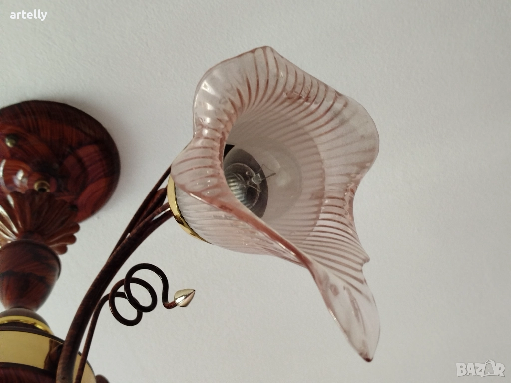 Античен полилей с 3 стъклени абажура. Тяло от метал с имитация на дърво, с елегантен дизайн. Подходяща за дневна, спалня или друго помещение.