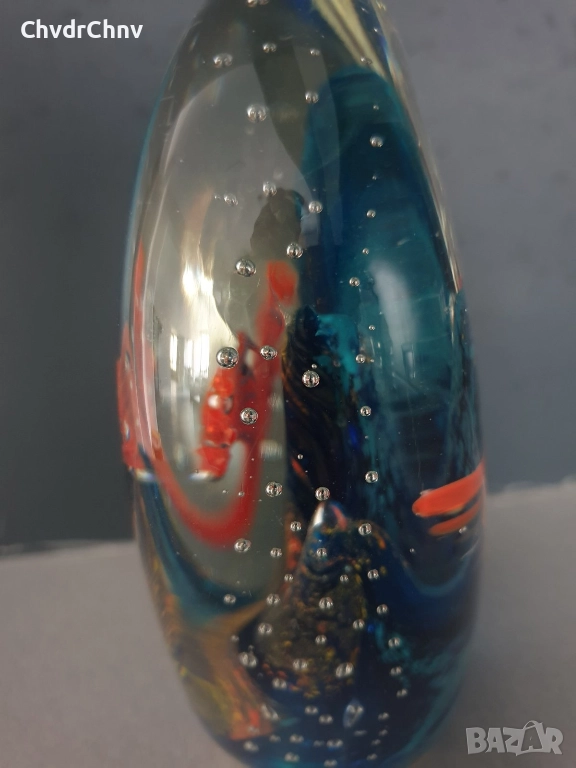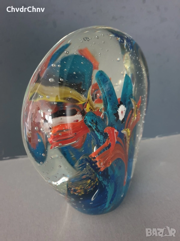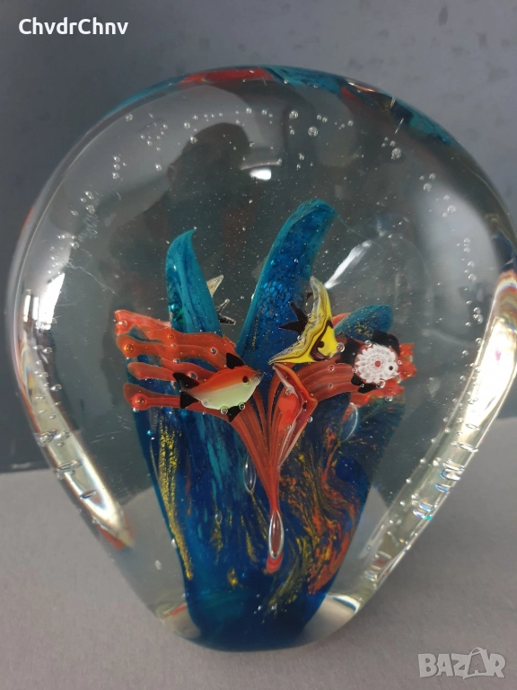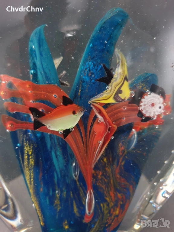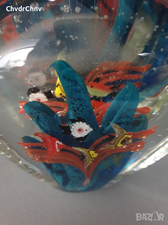 Височина 18 см, ширина 15 см, дебелина 7 см, тежи около 3 кг, ръчно направена от венецианско Мурано стъкло декорирано (отвътре) с въздушни мехурчета и многоцветни рибки и растения/водорасли.