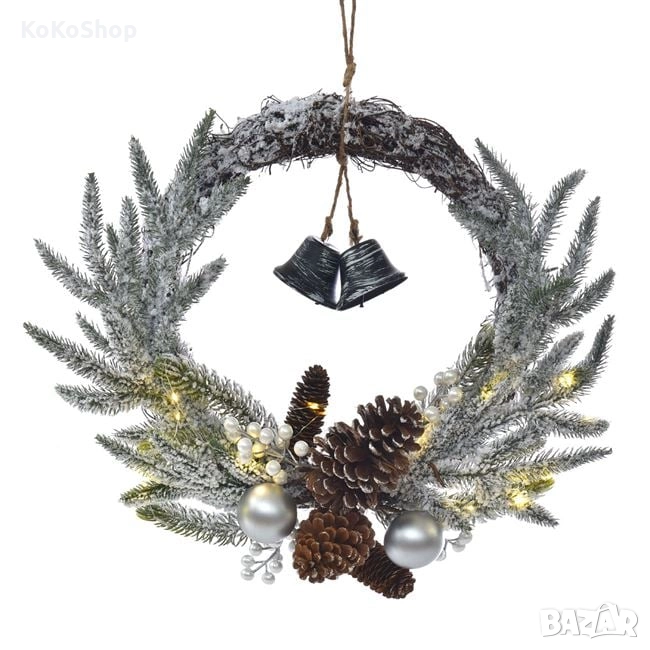 Коледен декоративен венец с реалистични клонки,шишарки,камбанки и,бели горски плодове и LED лампички.