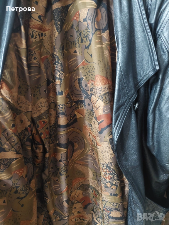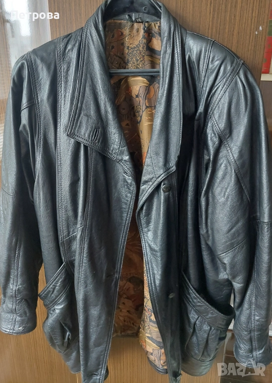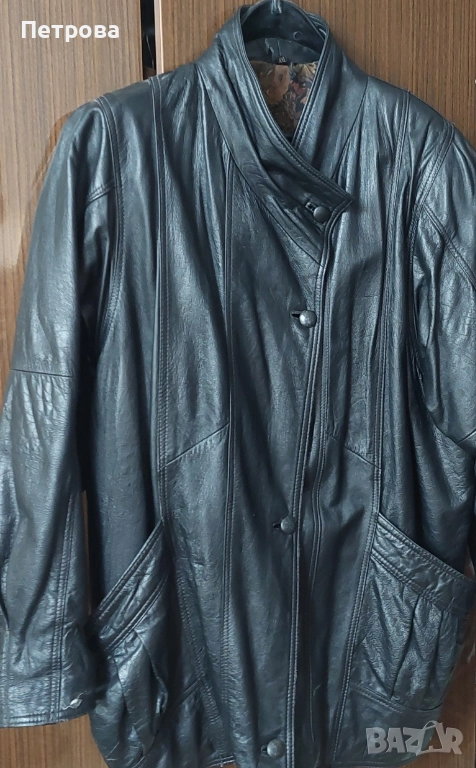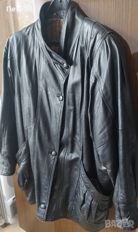 Кожено яке, черно, ново, гр. об. 120 см., дължина 80 см, с два дълбоки джоба, широки ръкави, красив дизайн в раменете, дълж. на ръкава 67, модерно разкроено, с ефектна подплата, естествена кожа, по етикет XXL цена 160 лв. Изпраща се с 10% отстъпка от общоприетата куриерска такса.