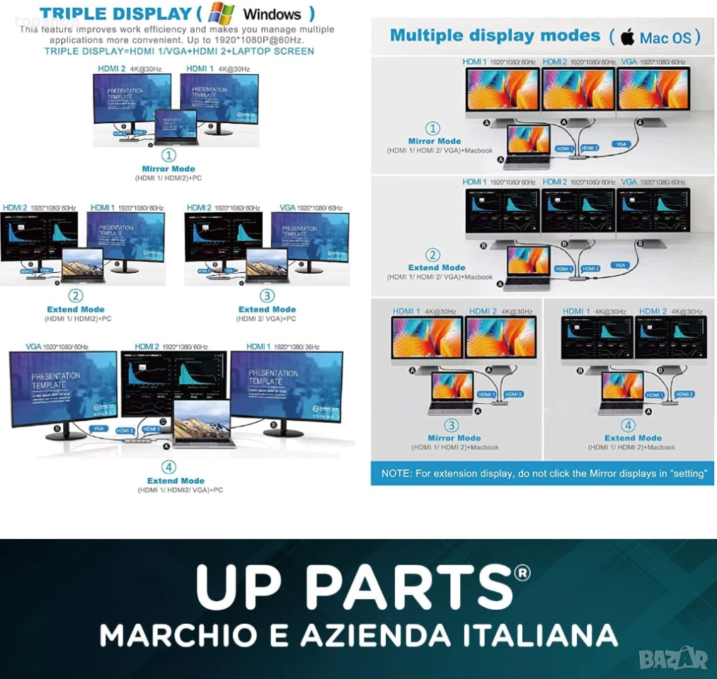 Нова проверена докинг станция UP PARTS usb-C хъб, UP-DS-9830K, 14 в 1 с Kensington Lock, 2 HDMI 4K, VGA, USB 3.0, RJ45 Gigabit Ethernet, 3.5 мм аудио, SD/TF четец, PD 100W, за лаптоп и компютър