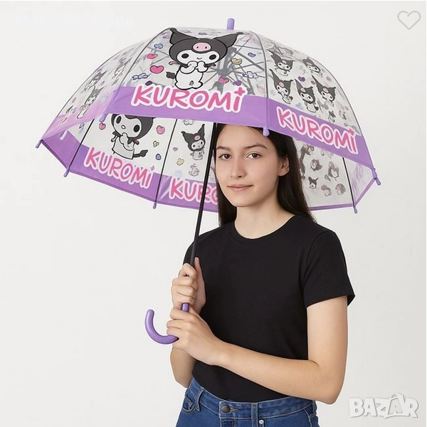 Чадър за дъжд за момичета, прозрачен с лилави цветове и дизайни Kuromi. Има извита дръжка и механизъм за автоматично отваряне. Дължина: 66 см