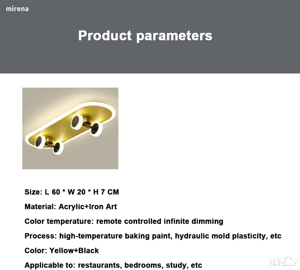 1. Размер: Д60*Ш20*В7см, Мощност: 32W, AC: 110-240V. Таванната лампа с дизайн на скейтборд с анимационен герой е най-добрият избор за детски стаи и детски ясли.