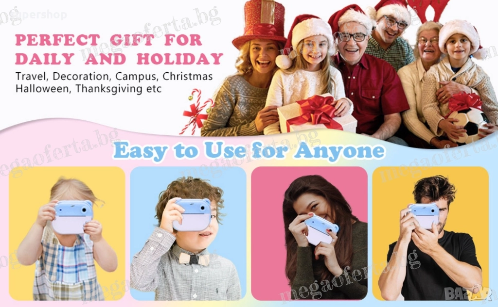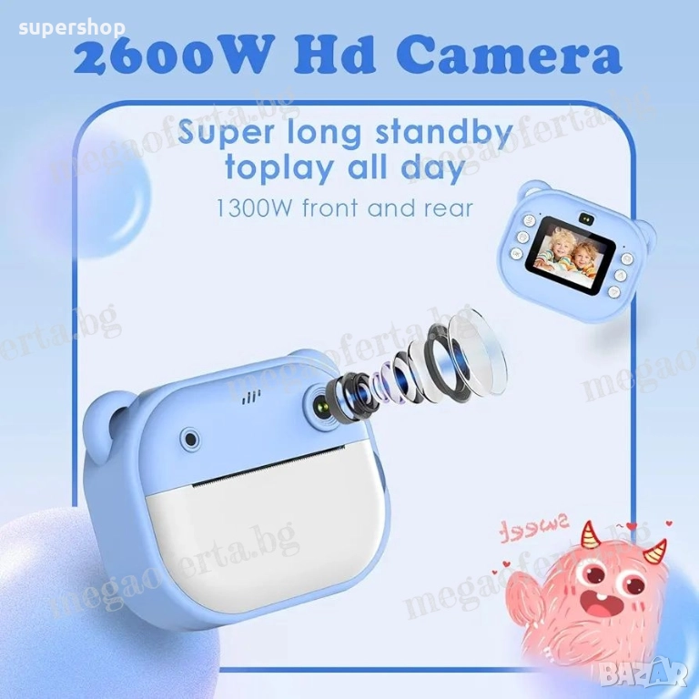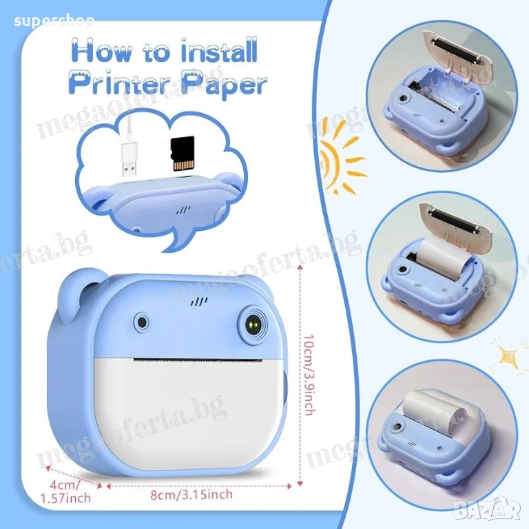 Детски Фотоапарат камера с незабавен печат и функции „Направи си сам“ → Обява 52447412