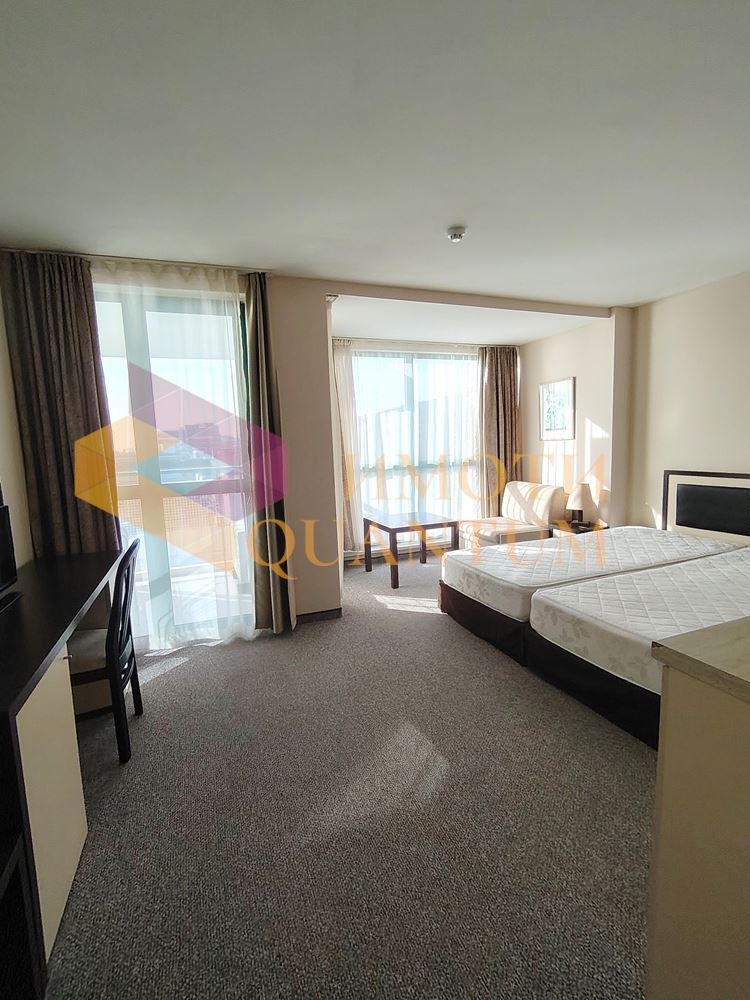 едностаен апартамент с обща площ 47,64 кв.м - студио в к.к. Златни пясъци. Жилището е с чиста площ 36,76 се състои от входно антре, просторна стая с кухненска част, санитарен възел и тераса с уникална гледка към плажа и морето. Предлага се напълно обзаведено и оборудвано - спалня, разтегателен фотьойл, кухненски шкафове с котлони, ширм и хладилник, климатик, телевизор, два гардероба, бюро. Банята е голяма, оборудвана с душ-кабина и бойлер. Имотът е в отлично състояние, не се нуждае от ремонти.