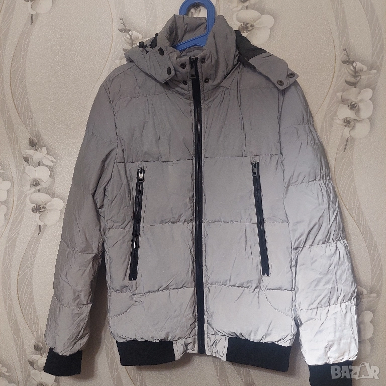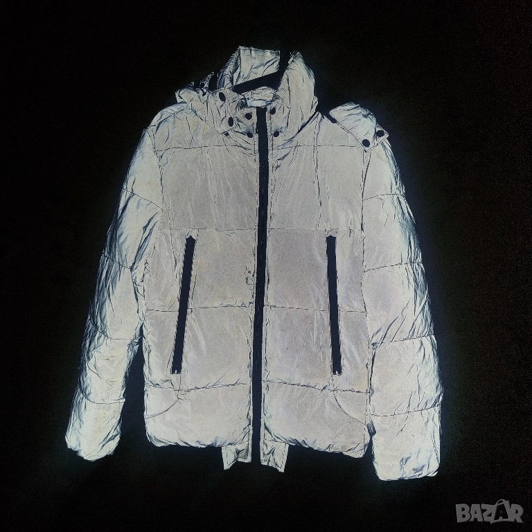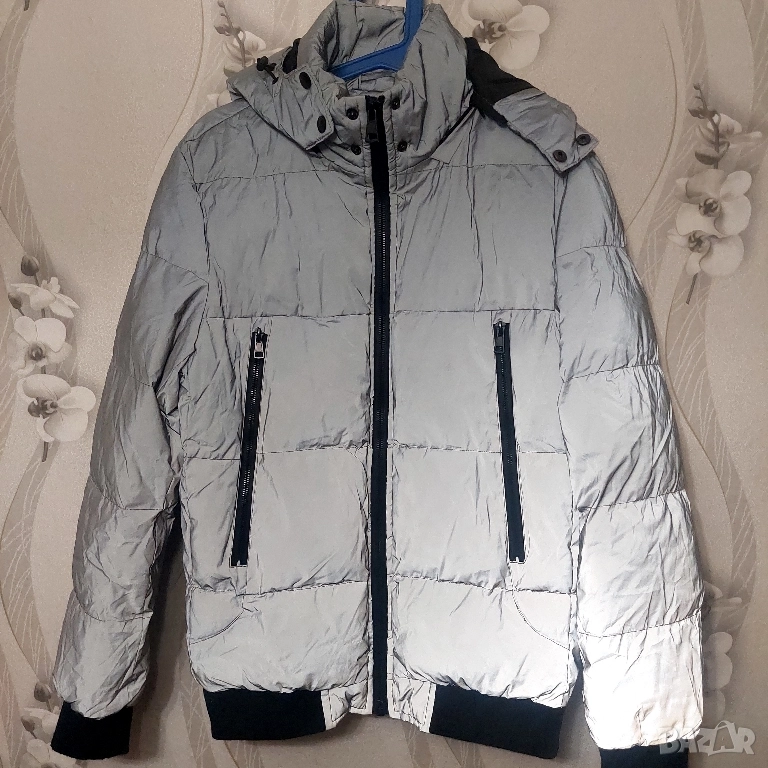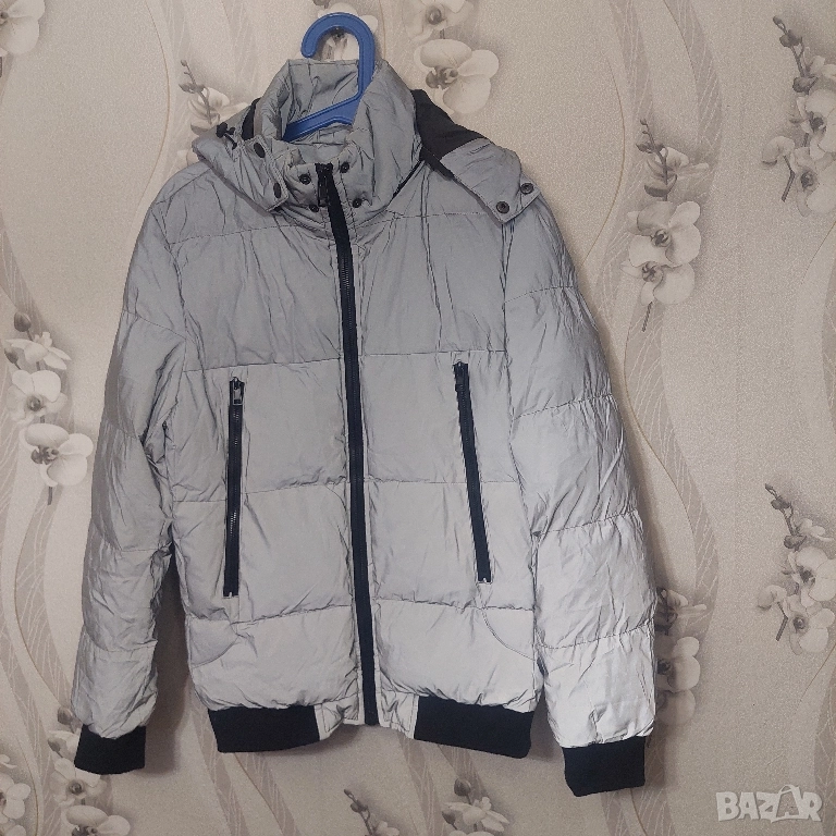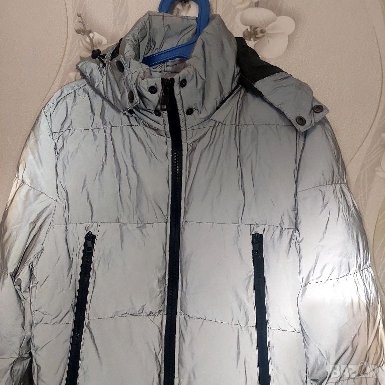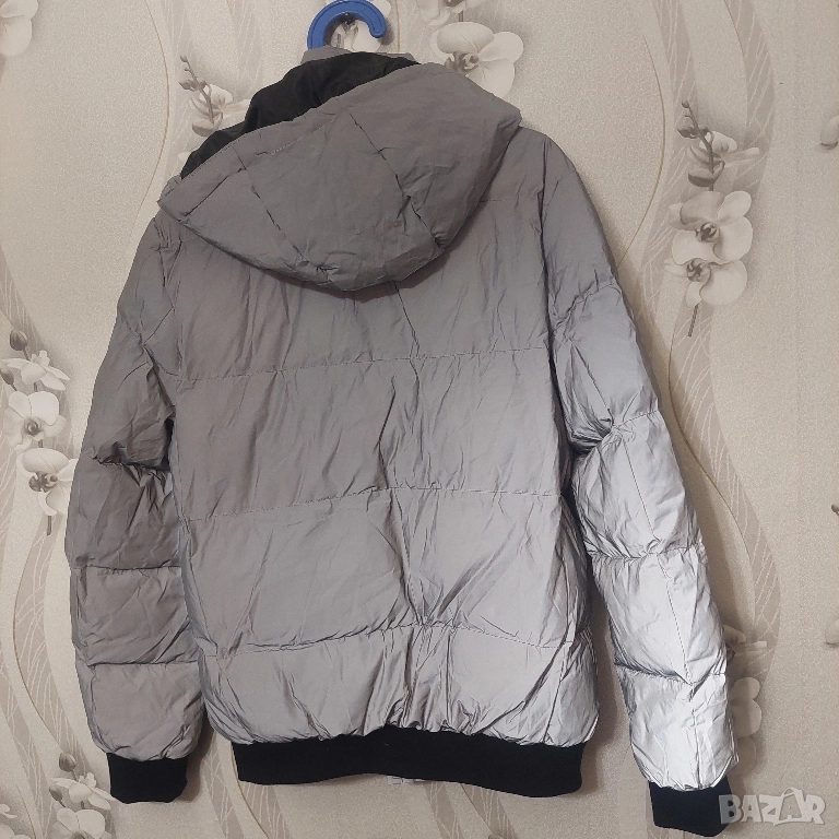 светлоотразителен цвят и черни детайли по циповете и маншетите. Якето разполага с: Дизайн: Капитониран дизайн с хоризонтални шевове. Цвят: Основният цвят е сив, който изглежда светлоотразителен, което е популярна функция за безопасност и стил. Характеристики: Включва интегрирана качулка, два предни джоба с вертикални черни ципове и централен преден цип. Материал: напълнено със синтетична вата , което го прави топло зимно яке.
