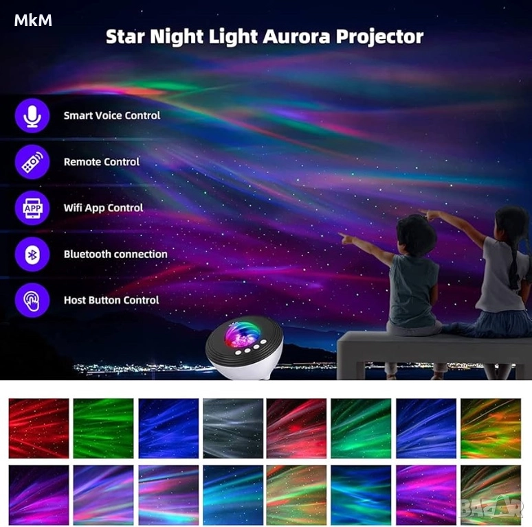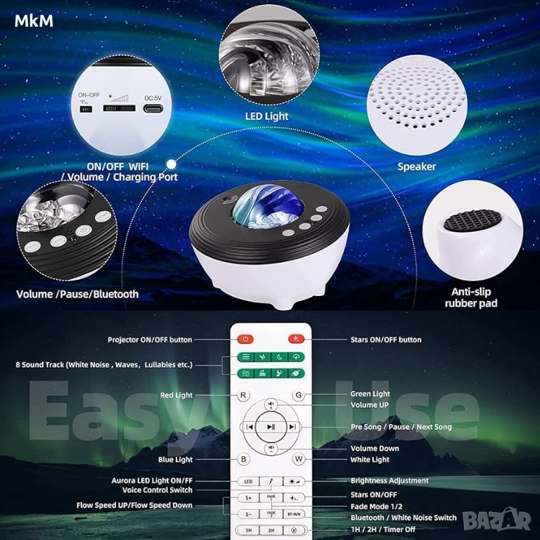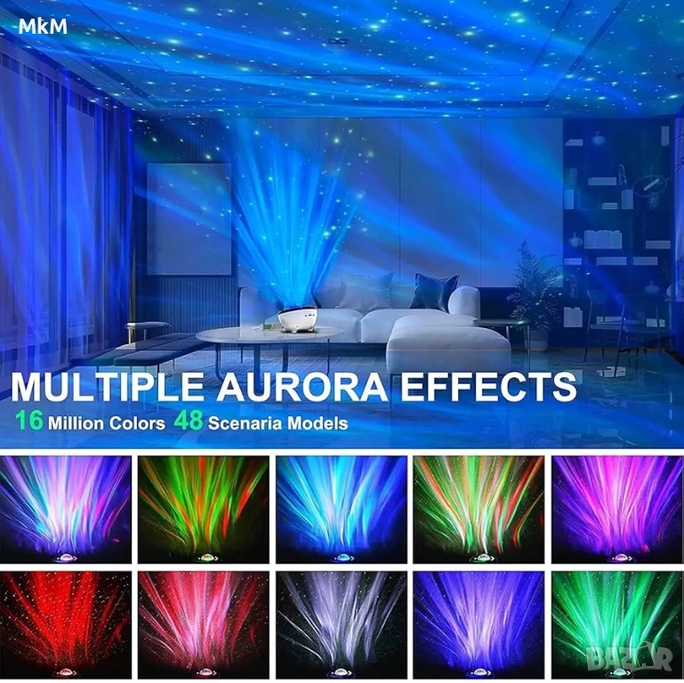 Нов ! Многофункционален 6 в 1 Звезден проектор Aurora Borealis: Светлинен проектор Aurora + Проектор с дъгова светлина + Проектор за синьо небе + Проектор със звездна светлина + Bluetooth музикален уред + Звукова машина с бял шум. 48 цветни режима, до 16,7 милиона светлинни ефекта. 360° въртящ се динамичен прожекционен светлинен ефект, осигуряващ прекрасна прожекционна производителност.