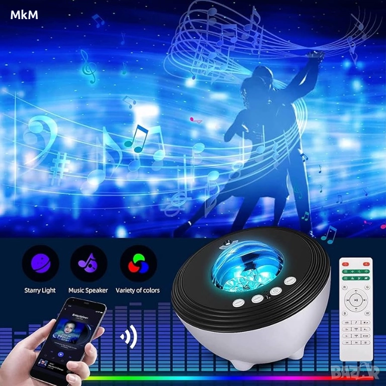 —Wi Fi музикален високоговорител: Просто се свържете със смартфона или таблета си чрез Bluetooth и ще имате HD високоговорители. Проекторът със звездна светлина може да трепти и да променя ритъма, танцувайки с музиката. Включете музиката, за да превърнете дома си в диско сцена, или включете люлеещия се звук, за да приспите вас или вашите деца под красивите звезди и светлините на полярното сияние. Регулируема сила на звука на музиката.