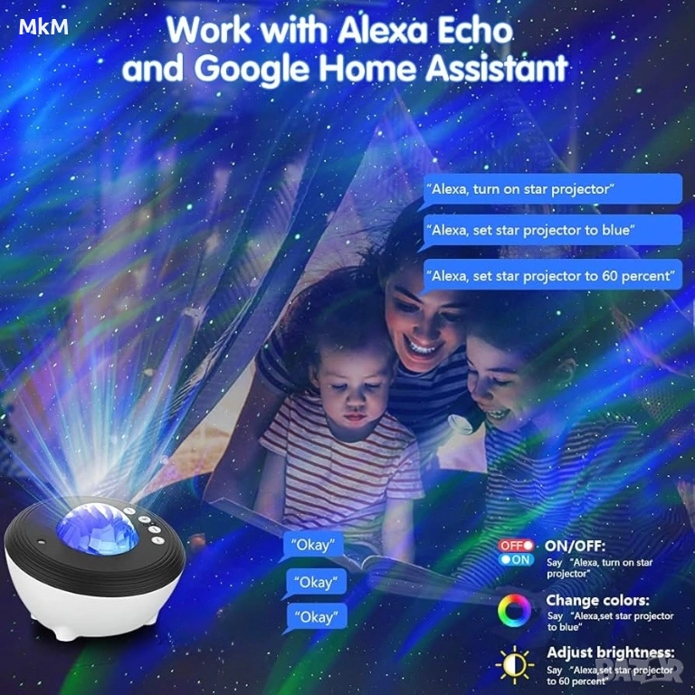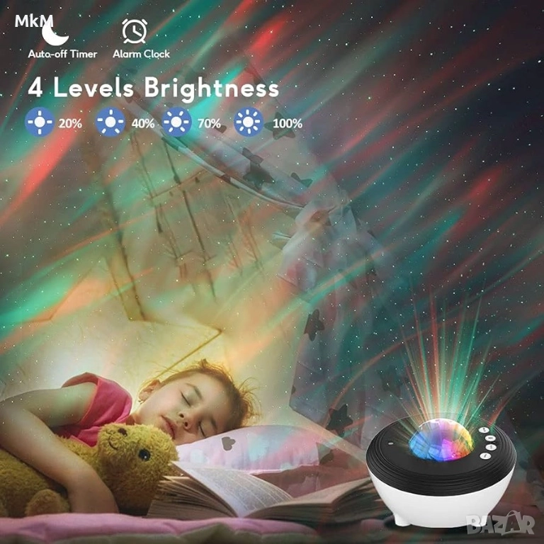 —-Автоматичен таймер, регулируеми сила на звука и яркост и голяма площ на покритие: 3 настройки за време: ИЗКЛ., 1H, 2H, автоматично изключване след зададеното време. С дистанционното управление можете лесно да променяте режима на осветление, цветовия режим, яркостта, скоростта, силата на звука, светлинния ефект. Звездната светлина може да покрие тавана или стените. Колкото по-голямо е разстоянието, толкова по-голяма е проекционната повърхност, максимална площ на покритие 60-120м кв