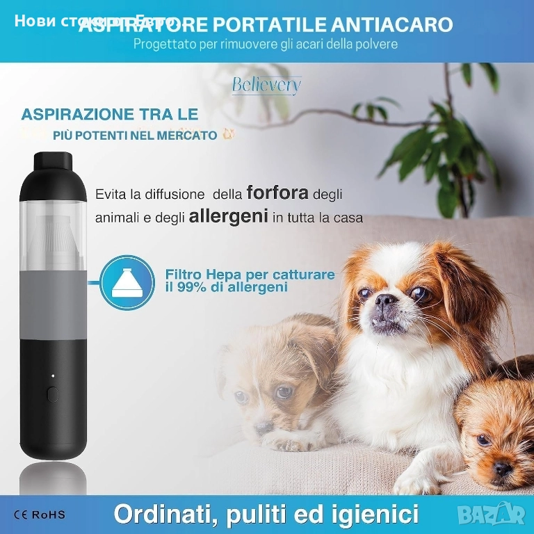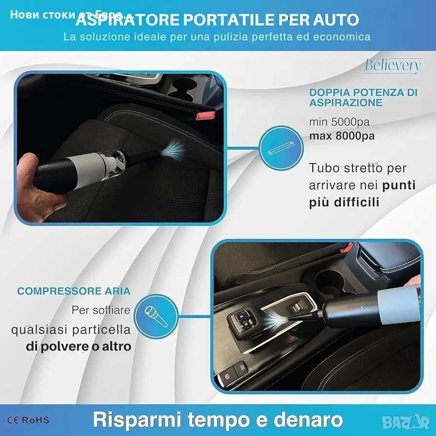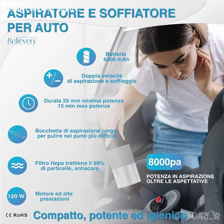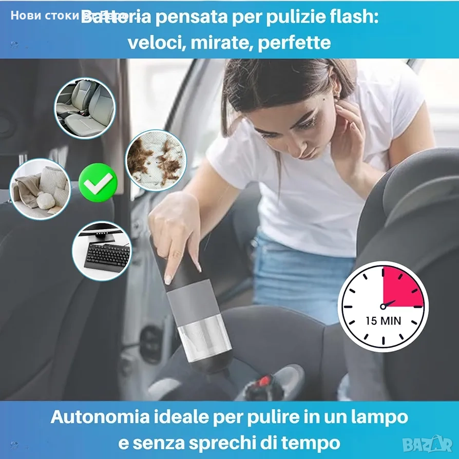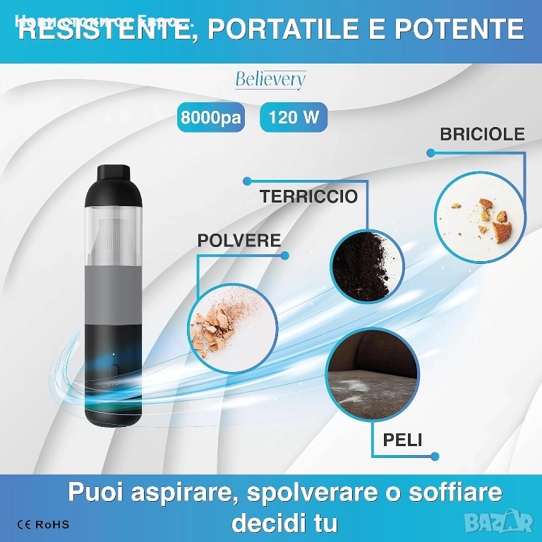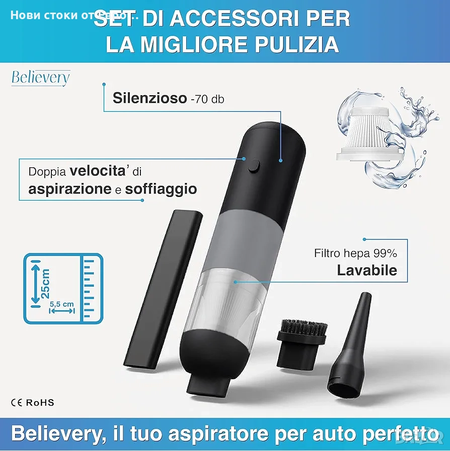 Безжична мини прахосмукачка, вашият спътник за цялостно почистване както на дивани, килими и труднодостъпни ъгли у дома, така и за почистване на трохи и прах в колата. Организирайте кухнята, като същевременно поддържате бюрото и устройствата си чисти на работното място. Производителността и комфортът на безжичната употреба ви дават несравнима свобода на движение. Изберете удобството на нашата мини прахосмукачка! ▪️ ✅ БЕЗОПАСНА И ХИГИЕНИЧНА: Насладете се на перфектно почистване с първокласната автомобилна прахосмукачка! HEPA филтърът улавя 99% от алергените, включително досадните косми от домашни любимци, осигурявайки здравословна среда за вас и вашите пътници. Може да се пере и използва многократно, винаги поддържа максимална ефективност. Мощна прахосмукачка за кола, голям кош за боклук. Изпитайте перфектното и здравословно удоволствие от почистването с нашата безжична ръчна прахосмукачка. ▪️ ✅ СЕРТИФИЦИРАНО КАЧЕСТВО: Нашата мощна прахосмукачка за кола е изработена от висококачествен сертифициран материал в съответствие с европейските стандарти за безопасност, ISO 9001, SGS, ROHS и CE. С нашата прахосмукачка за трохи с батерии можете да се насладите на чисто и екологично почистване. Безжичната прахосмукачка за кола гарантира безопасност и хигиена.