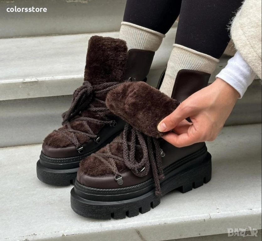 Боти на платформа - кафява кожа с кафяв пух - BPUH1