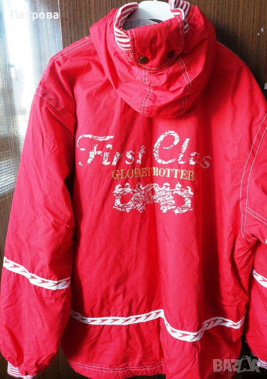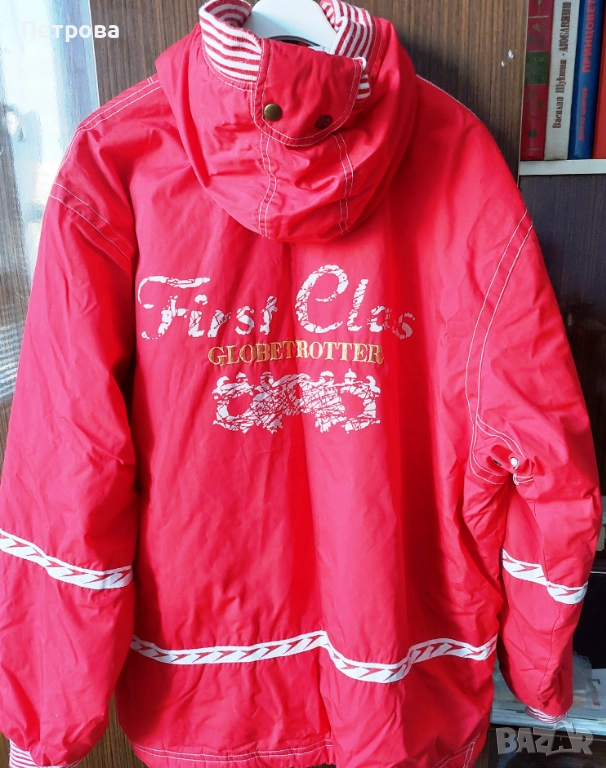 Червено яке с качулка, с бели ивици на маншетите и качулката, както и като декорация отзад на якето, с два джоба, по етикет размер М, гръдна обиколка 150, дължина на ръкава 65, дължина на якето 80 см, запазено, цена 20 лв. или 10 евро. Изпраща се с 10% отстъпка от общоприетата куриерска такса.