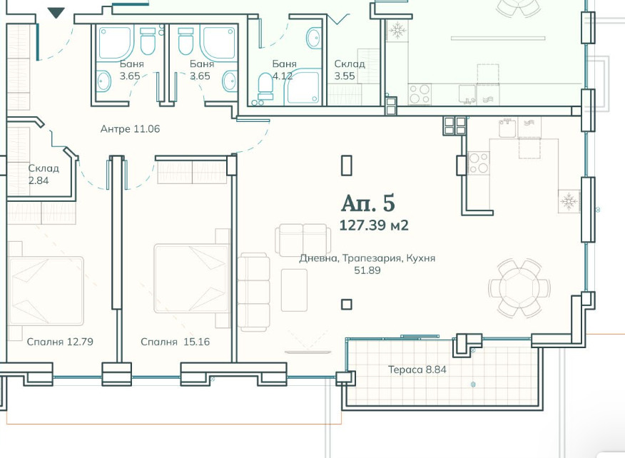 Към апартамента принадлежи и тераса от 9 кв.м, подходяща за релакс зона, зеленина или приятно място за сутрешно кафе.