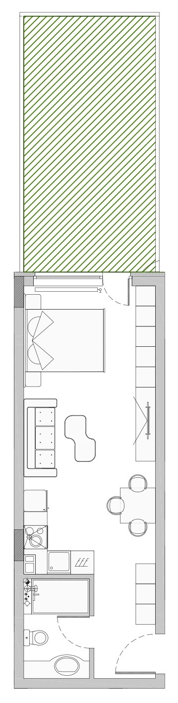 РАЗПРЕДЕЛЕНИЕ: Входно антре, просторна всекидневна с кухня и трапезария, санитарен възел и двор.