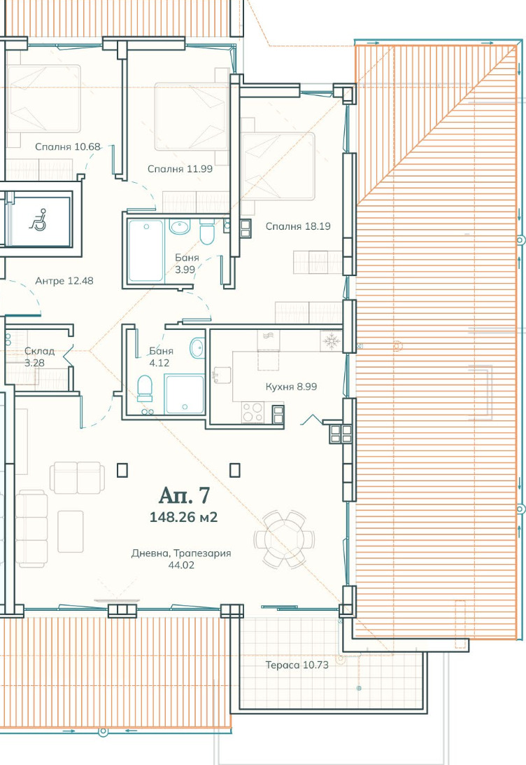 Към апартамента принадлежи и тераса от 11 кв.м, подходяща за релакс зона, зеленина или приятно място за сутрешно кафе.