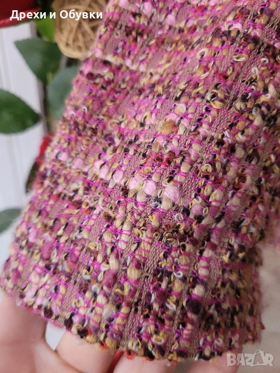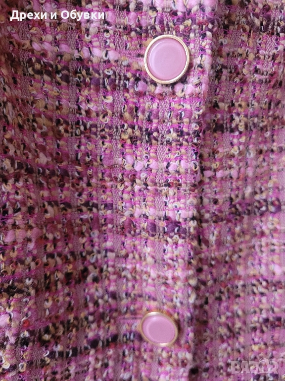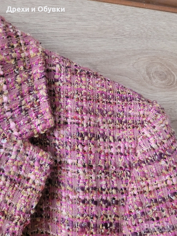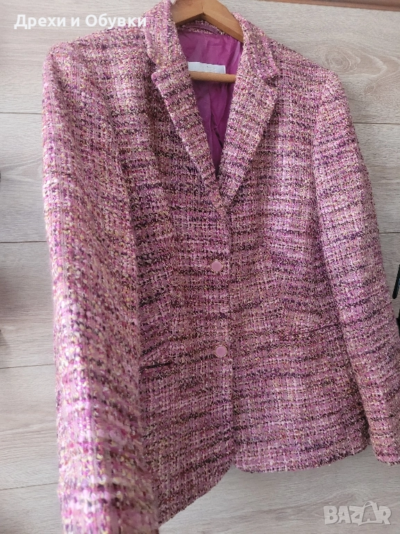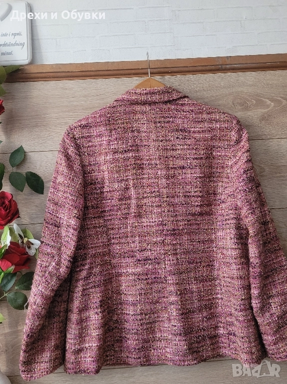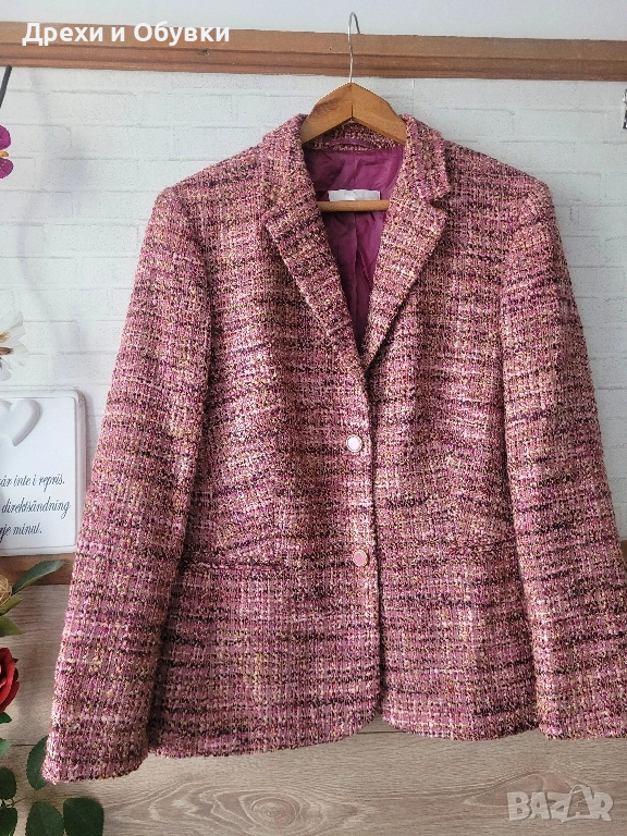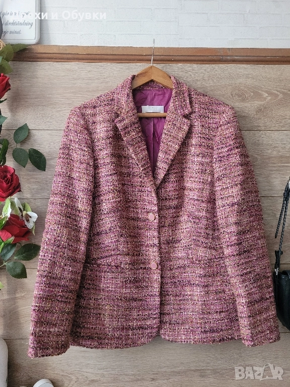 Стилно, елегантно и топло сако в розово букле. За офис визия или за ежедневието с дънки. В състава 70% агнешка вълна ( SCHURWOOL). Размер Л. Гръдната варира 108 до 110см .
