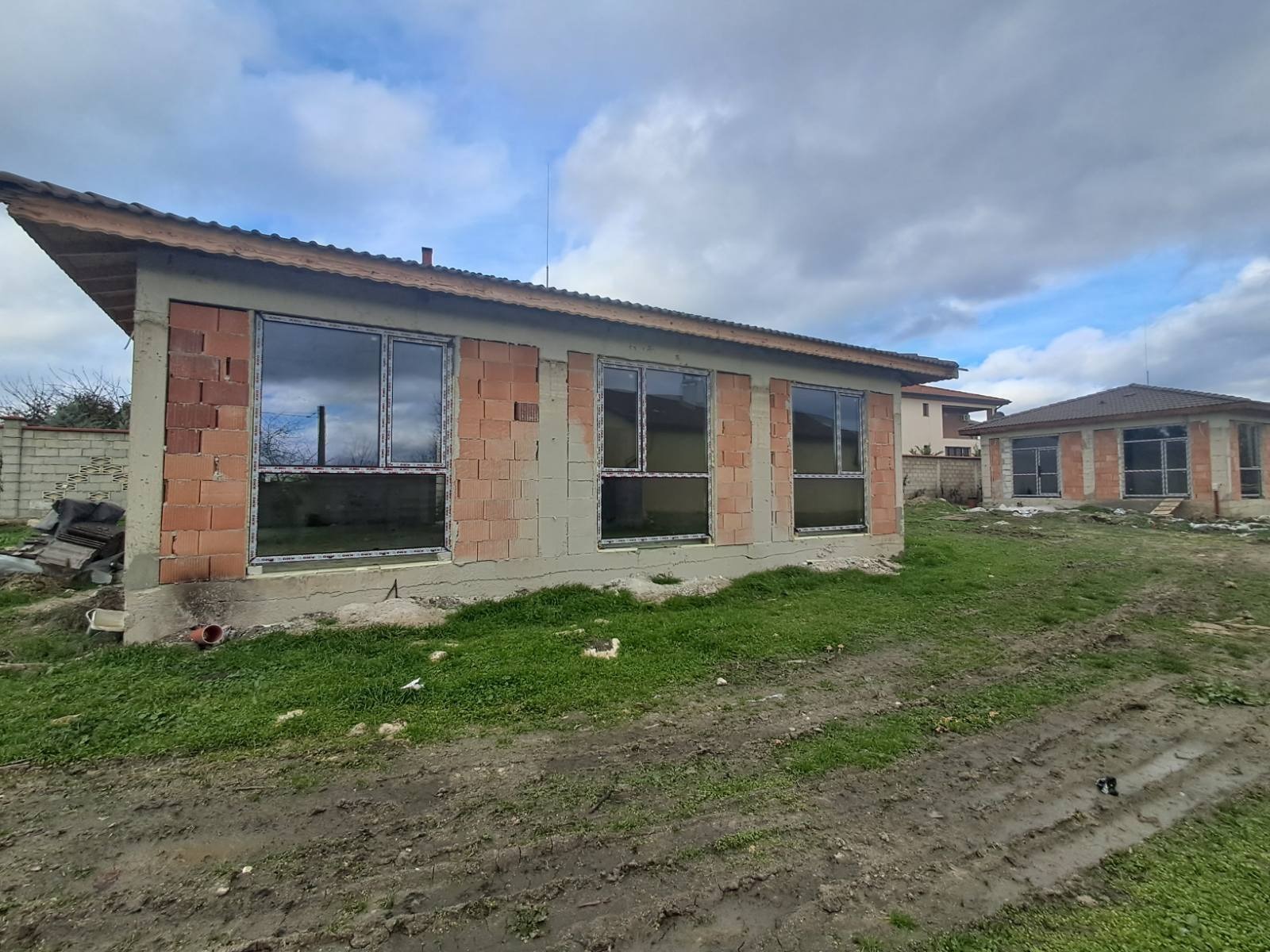 Едноетажната къща е тухлена, на етап на строителство издаден Акт 14. Ще бъде въведена в експлоатация (Акт 16) през 2026 г. Дворното място към нея е с площ 754 кв.м, с две открити паркоместа, включени в продажната цена. Достъпът до имота е по асфалтов път. В съседство има новопостроени къщи.