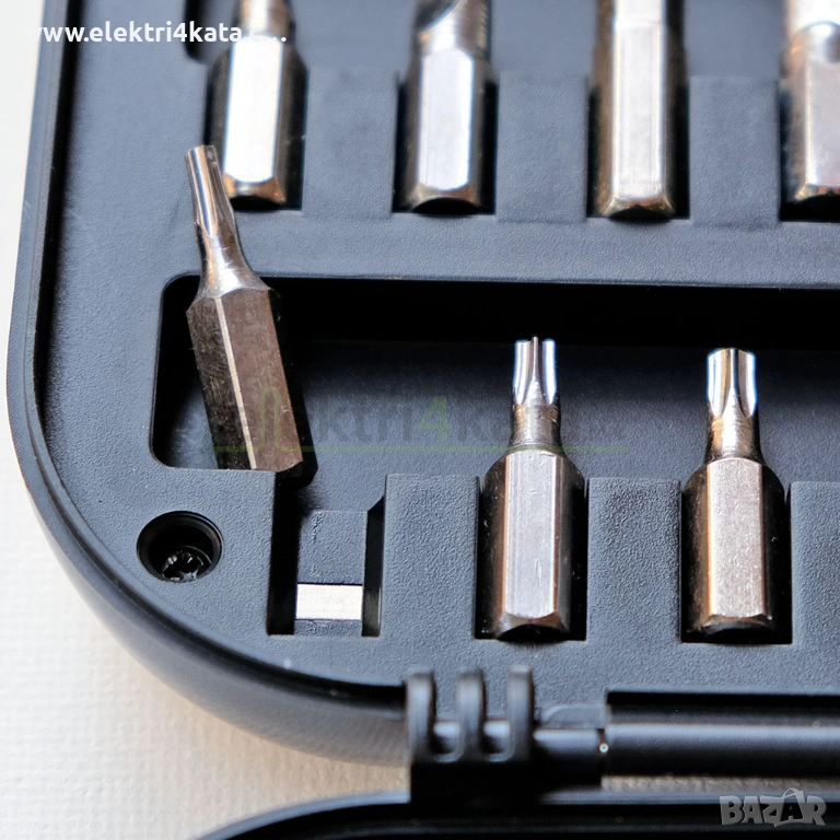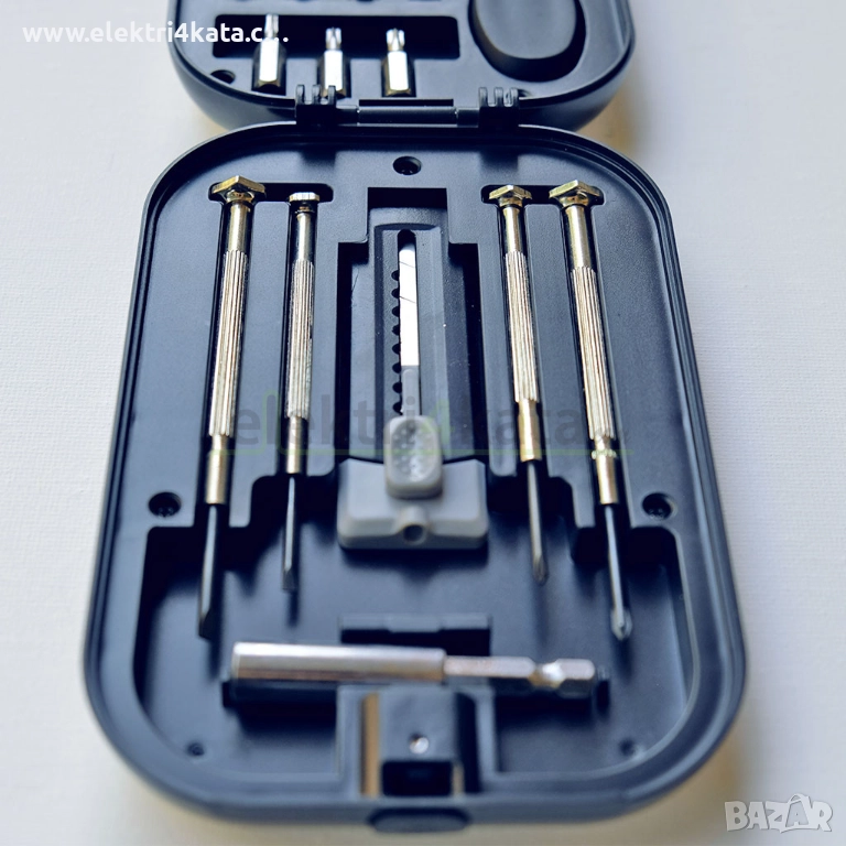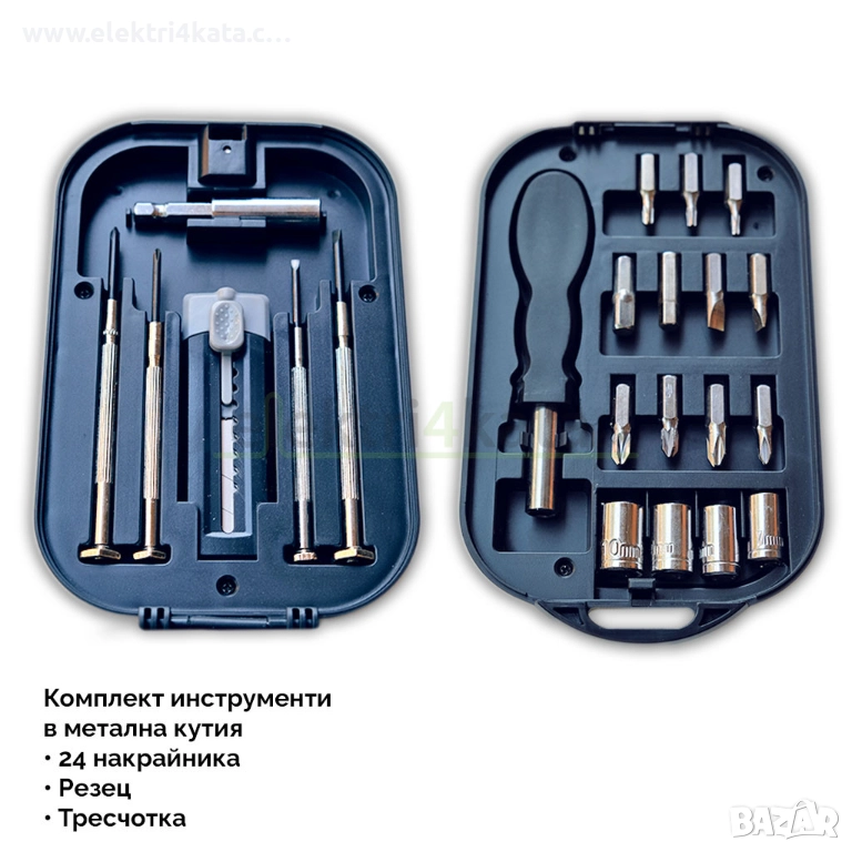 Практичният комплект инструменти в метална кутия е идеалният спътник, когато сте на път. Изработен от висококачествена пластмаса и метал, той осигурява здравина, издръжливост и дълъг живот при ежедневна употреба. Комплектът включва 24 накрайника, 1 бр. тресчотка и 1 бр. резец, подредени в удобна метална кутия с размери 10,5×18×4 см. За допълнителен комфорт и сигурност отделенията са снабдени с магнити, които държат инструментите стабилно на място.