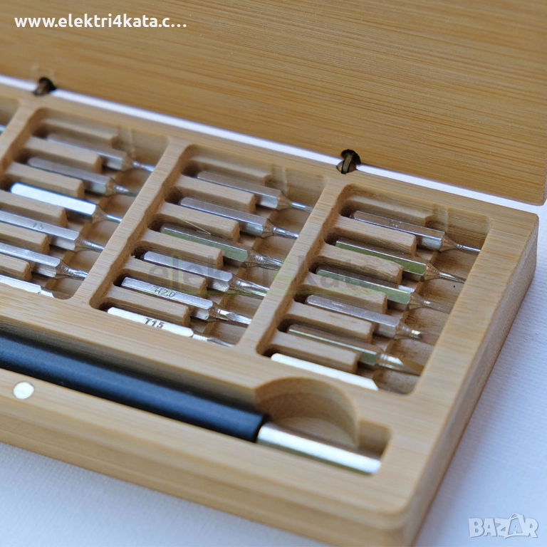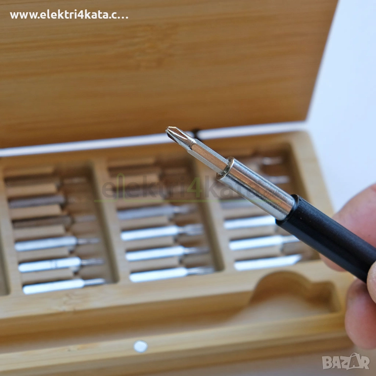 Комплектът включва 24 накрайника и отвертка-държач, подредени в изящна кутия от естествен бамбук. Капакът има магнитна връзка за сигурно затваряне, което осигурява лесен достъп и стабилност при пренасяне. Бамбуковата кутия придава луксозен и екологичен вид, а компактният формат прави комплекта подходящ за всякакви ситуации.