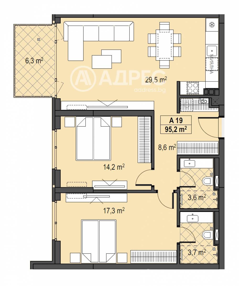 Прекрасен тристаен апартамент със западно изложение, позициониран на трети етаж с РЗП-105,69м2, просторни стаи и разкошна тераса. Върху площ от 95,2м2 са разположени: дневна с кухненски бокс и трапезария-29,5м2, спалня -17,3м2 с 3,7м2 баня към нея, втора спалня-14,2 м2, втора баня с тоалетна и тераса-6,3м2. Налични ПМ и гаражи.