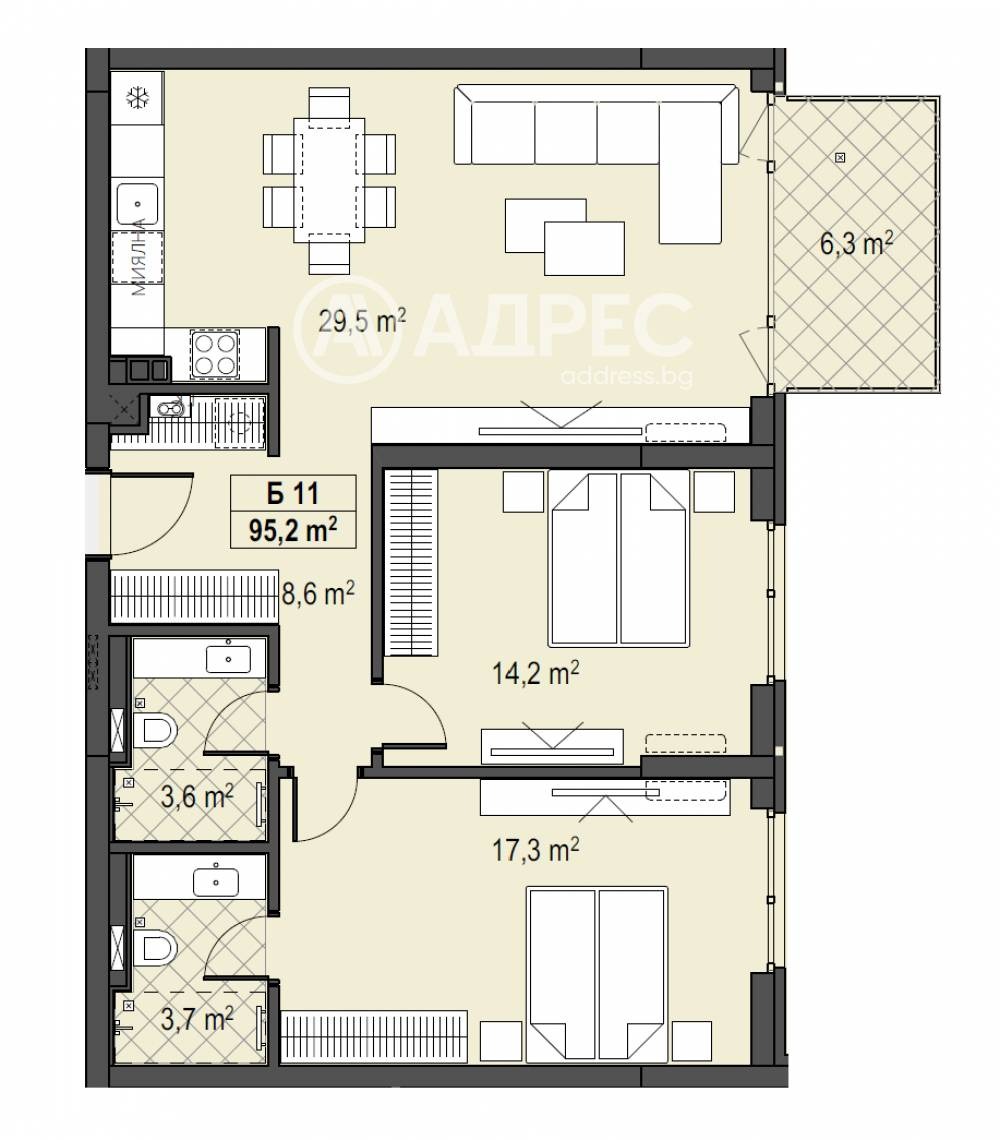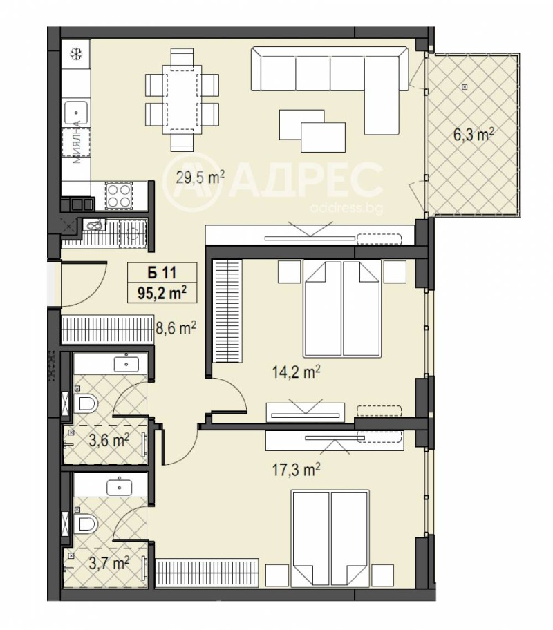 Прекрасен тристаен апартамент с източно изложение, позициониран на първи етаж над партер с РЗП-105,69м2, просторни стаи и разкошна тераса. Върху площ от 95,2м2 са разположени: дневна с кухненски бокс и трапезария-29,5м2, спалня -17,3м2 с 3,7м2 баня към нея, втора спалня-14,2 м2, още една баня с тоалетна-3,6м2 и тераса-6,3м2. Налични ПМ и гаражи.