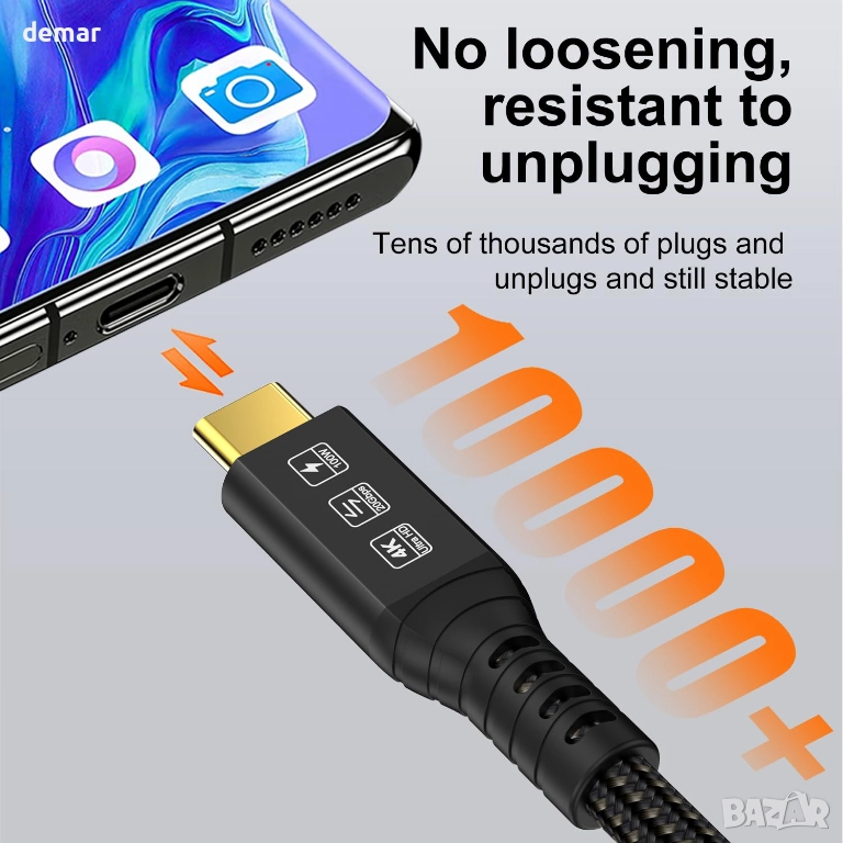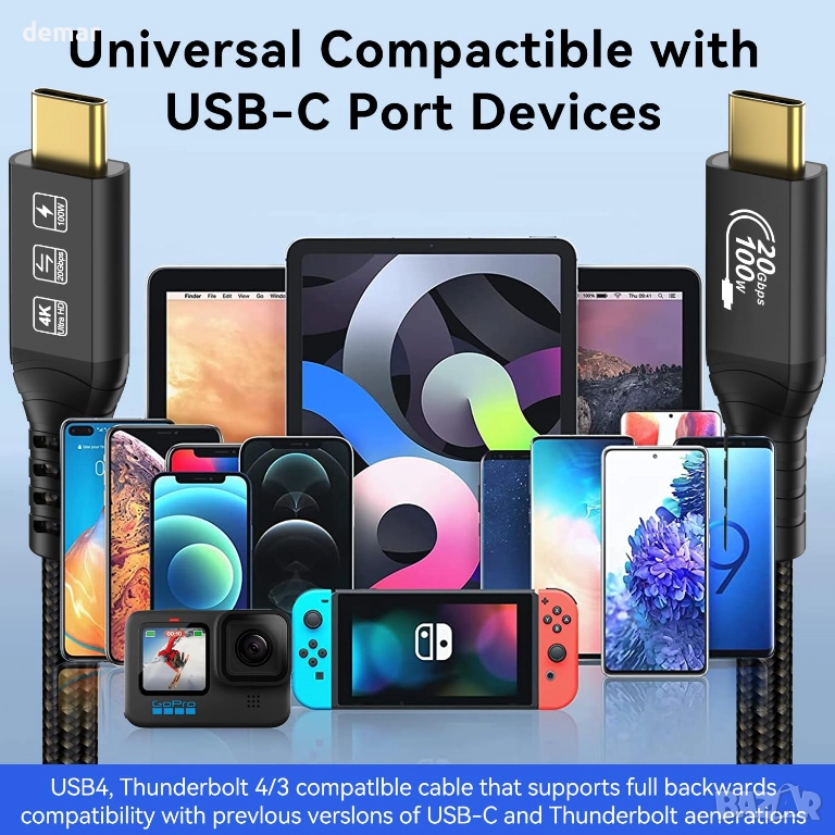 Този кабел осигурява бързо 100W PD зареждане с E-Mark чип за безопасно и ефективно захранване, поддържа 20Gbps трансфер на данни чрез съвместими USB-C или Thunderbolt портове и предлага 4K@60Hz видео изход за свързване на лаптопи към външни дисплеи. Той работи като универсален захранващ, информационен и видео кабел за широка гама от устройства, включително лаптопи, таблети, телефони и геймърски слушалки, и е с издръжлив дизайн с найлонова оплетка и 24-каратово позлатени, облекчени от напрежение конектори за дълготрайна работа.