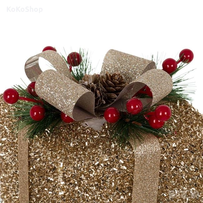 коледен подарък,в златист цвят, със златиста панделка,зеленина,червени горски плодове и шишарки.