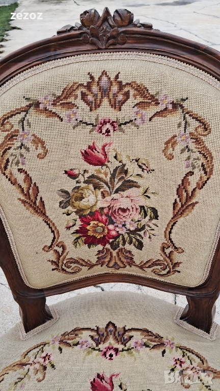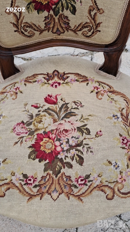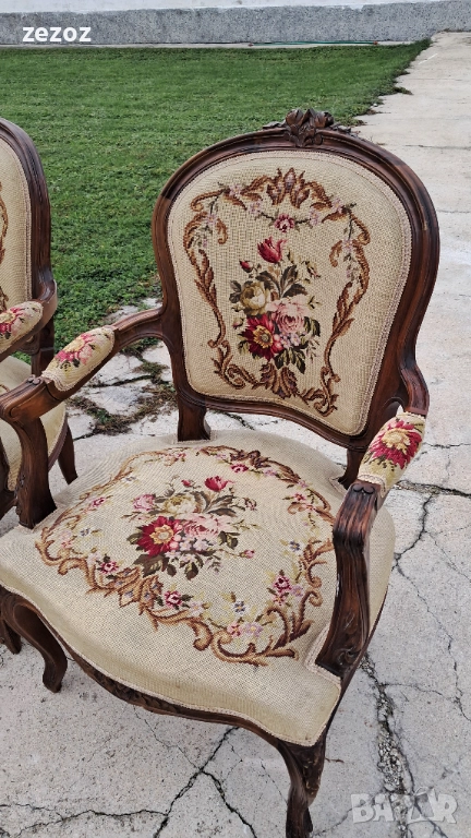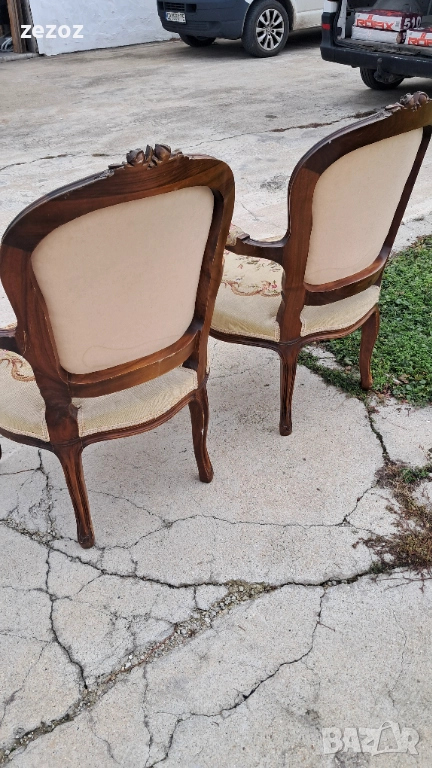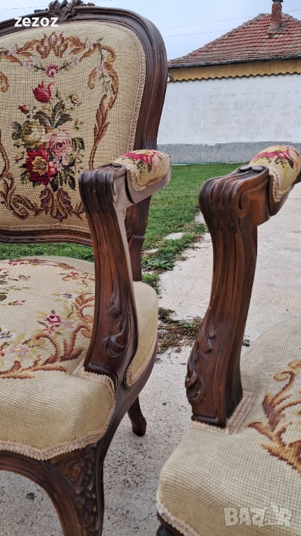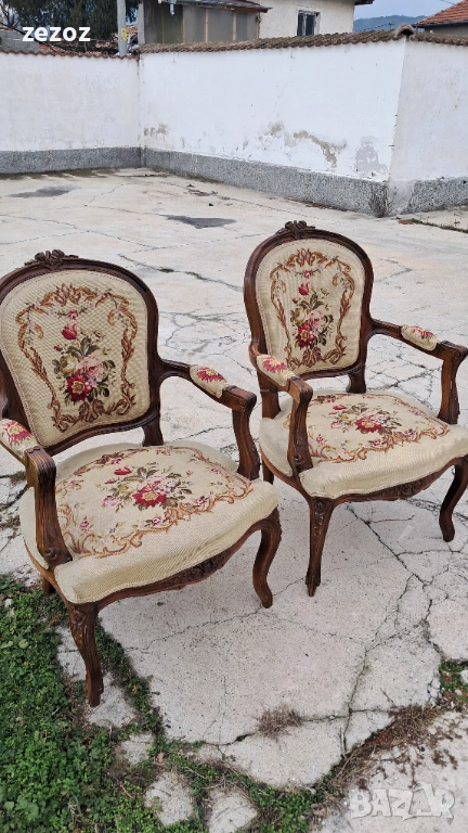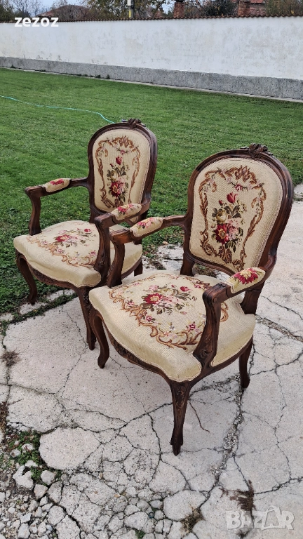 Антикварни кресла ръчна изработка от махагонов масив в стил "Рококо"-Луи 15.Креслата са от по-големите и широки.Гобленова дамаска в много добро състояние,старатасистема на седалките-ремъци и пружини.Оригиналния дюшеклък-слама.Много леки козметични забележки по дамаската,видимо на снимките.Размери-
