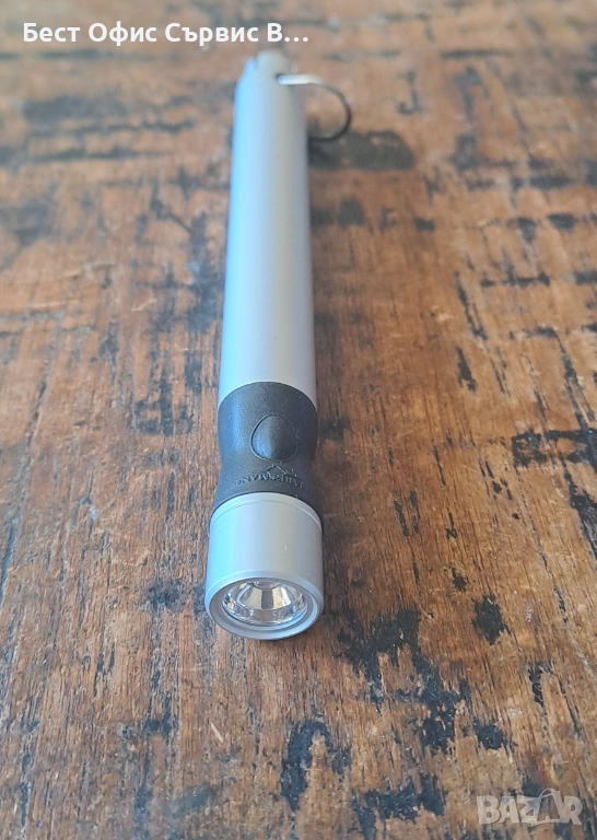 Продавам фенерче метално сребърно Марксман Marksman. Работи с 1 брой ААА 1.5 V батерия (не е включена в цената). Има метално рингче, с което може да се закача. Размер на фенерчето : дължина 14.5 cм, и диаметър 1.5 см, диаметър на светещата част 1.2 см. В оригиналната си кутия, която не е в перфектно състояние. Размер на кутията 15.5x2.5x2.3 cм. Уникално, чисто ново. За ценители.