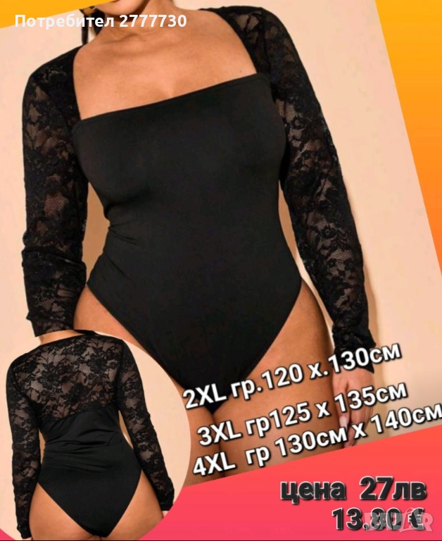 Ефектни боди блузи. В размери 3XL гр125 х 135см. Супер материя и дантела с еластан. Направете елегантен тоалет към пола или панталон. Почувствайте комфорта.Ако ви харесват изпрати съобщение. Бързи доставки по Спиди и Еконт опция преглед след куриерска доставка.