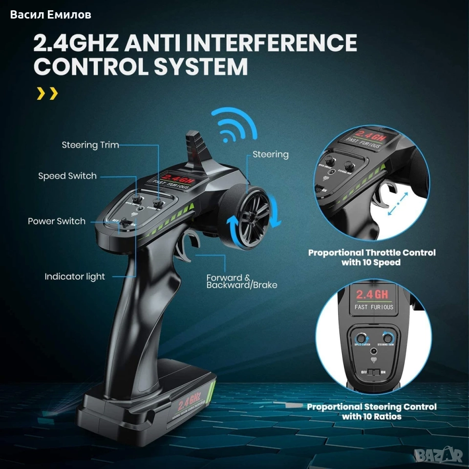 2,4 GHz система за контрол против смущения: 2,4 G честота осигурява управление с бърза реакция, максималният работен обхват е до 100 м (330 фута), което е много по-широк от други RC автомобили, което ви позволява да се състезавате с други превозни средства без смущения. Тази хоби машина е предназначена за начинаещи и напреднали потребители.