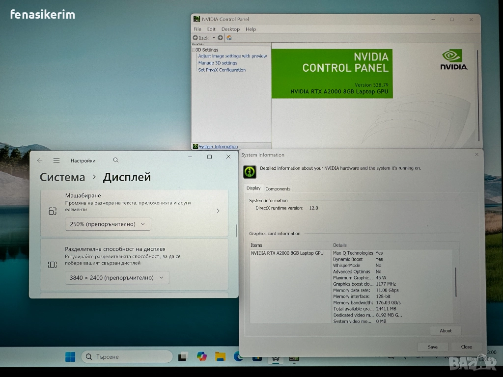 2 видеокарти : Nvidia RTX A2000 128bit 8GB DDR6 собствена памет + Intel UHD Video - up to 16 GB Total Graphics memory.