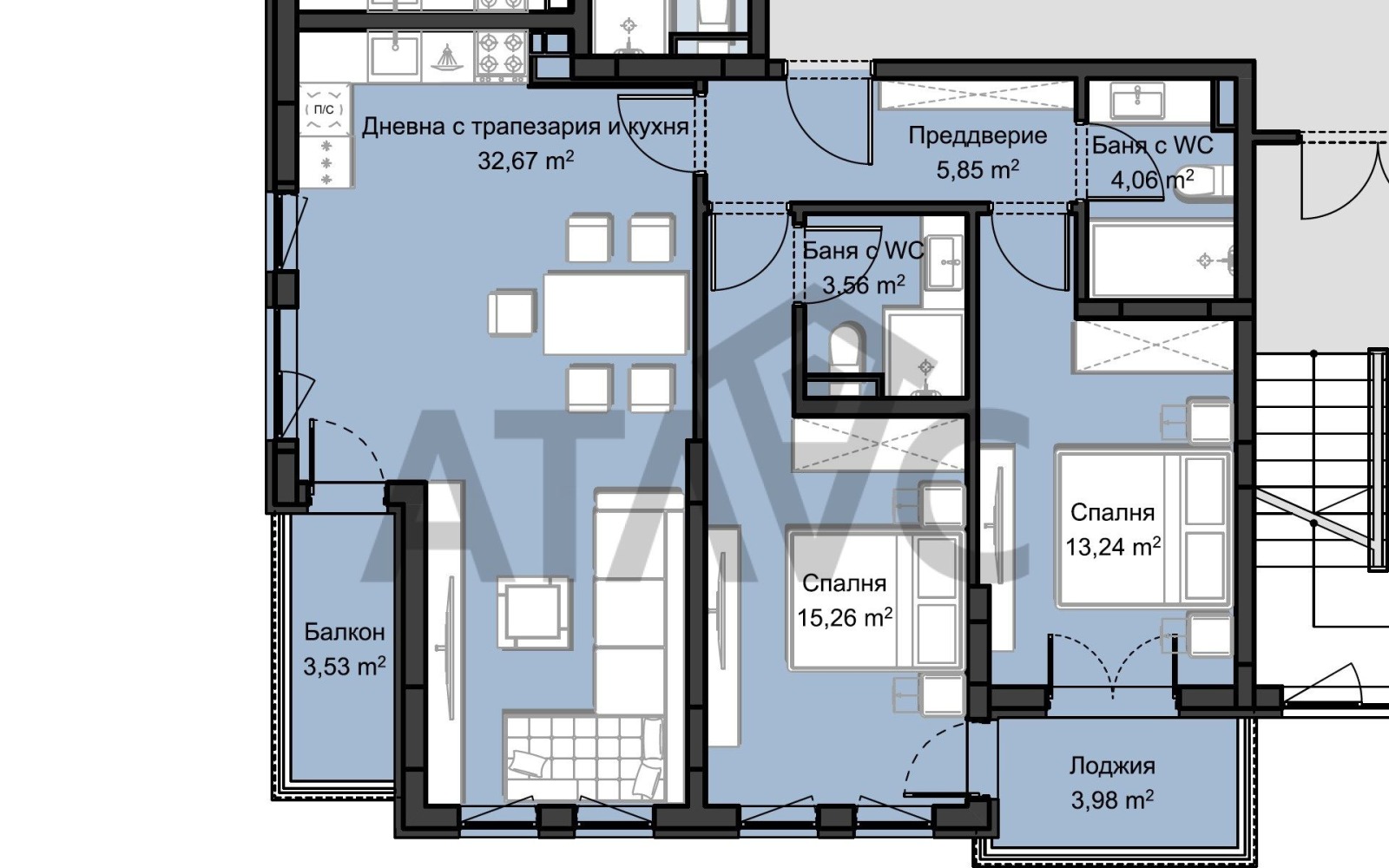 Жилището е функционално разпределено с всекидневна и кухненска зона, тераса, две спални една от които със собствена баня, излаз към тераса и от двете спални помещения, отделна баня с тоалетна и просторно входно антре.