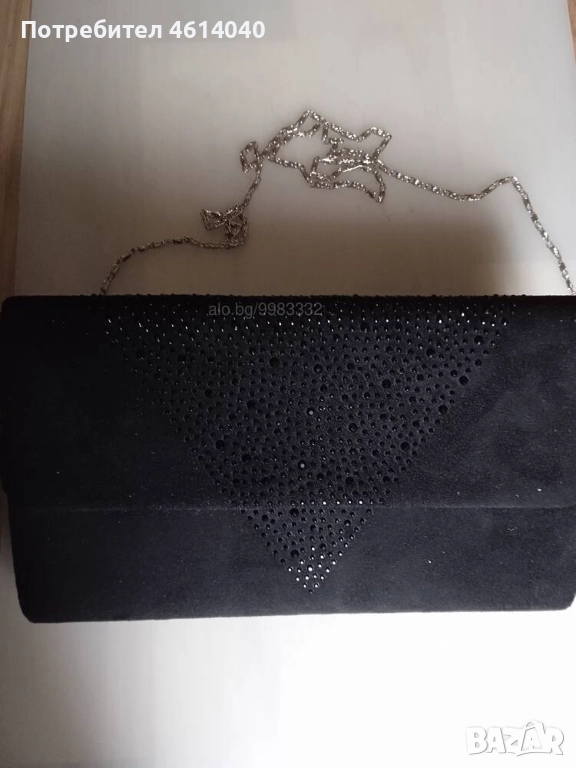 Елегантната дамска чанта клъч, не се ползвана, запазена е. Цвятът е черен. Верижката е качествена, обща й дължина 112 см.